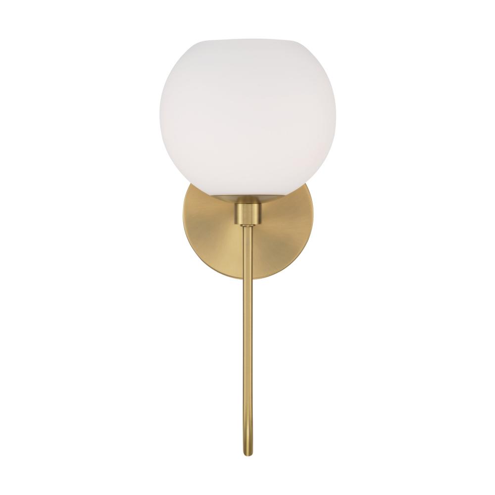 Playful forms meet sophisticated style in the Ansley 1-Light Sconce for HomePlace. The curved stem draws the eye toward the Soft White glass globe shade, while the Aged Brass finish creates a mid-century aesthetic.