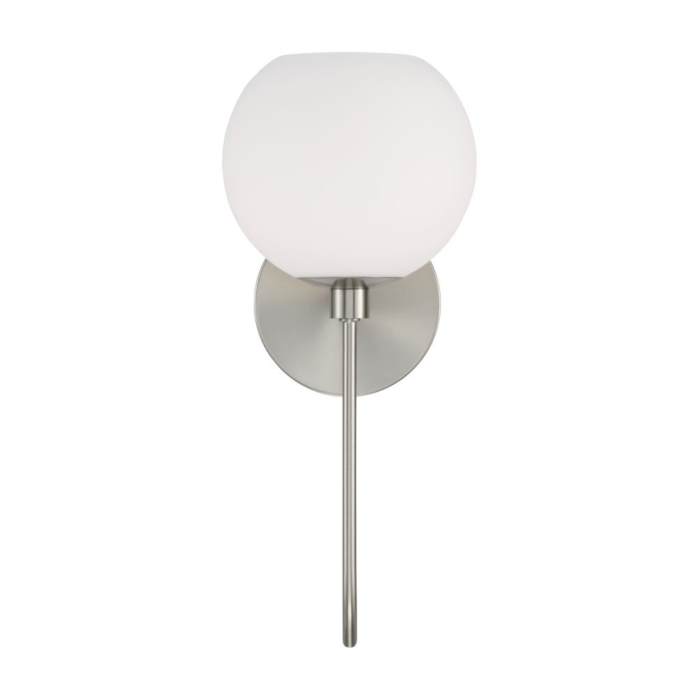 Playful forms meet sophisticated style in the Ansley 1-Light Sconce for HomePlace. The curved stem draws the eye toward the Soft White glass globe shade, while the Brushed Nickel finish creates a classic aesthetic.