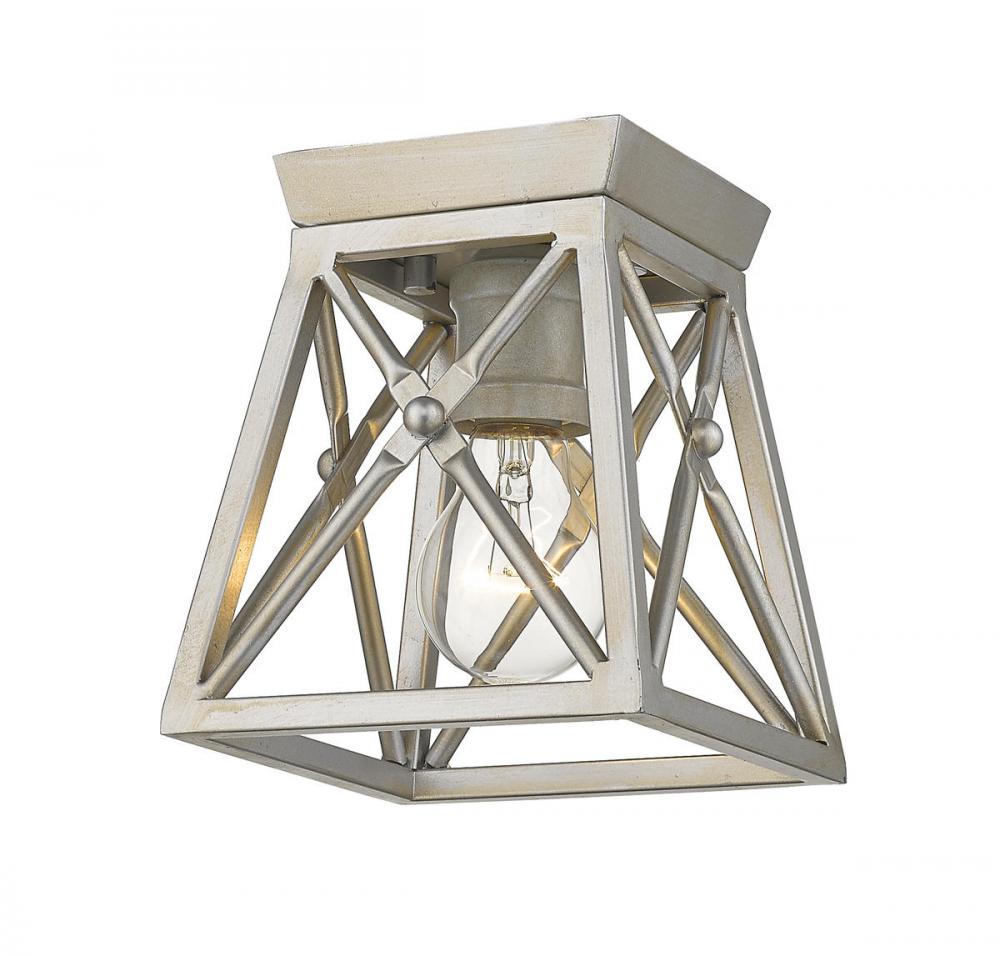 Indulge in an exercise of geometrics and stunning interior d?cor, adding this single-light flush mount ceiling light to a compact living space. Romantic inspiration from an industrial period combines a sleek Antique Silver finish metal cage shade with a charming wide bulb mount, offering an artistic and character-rich embellishment to transitional settings.