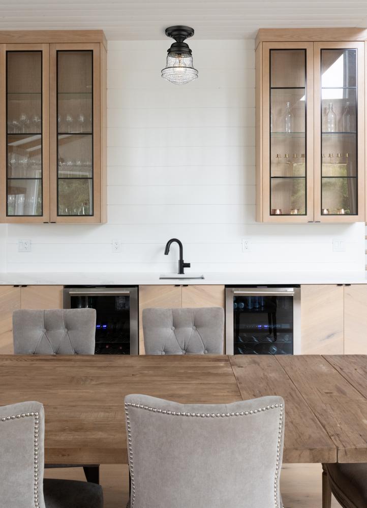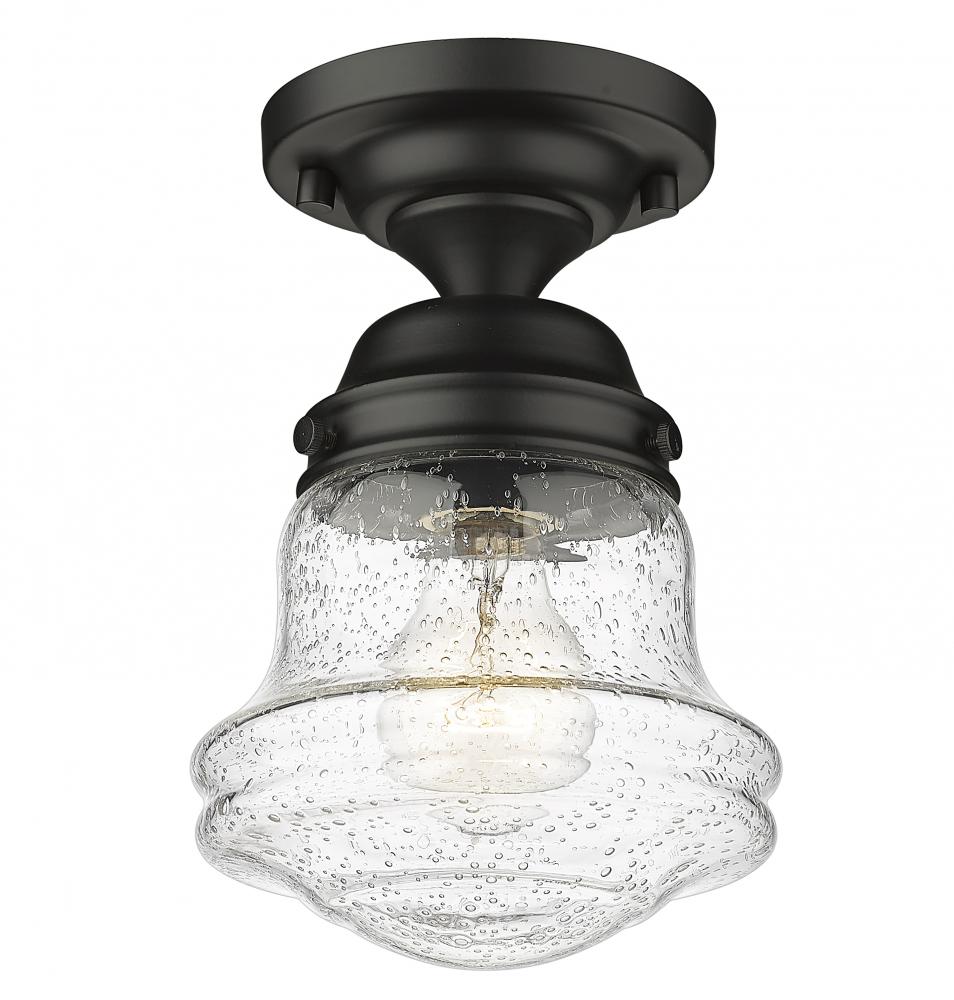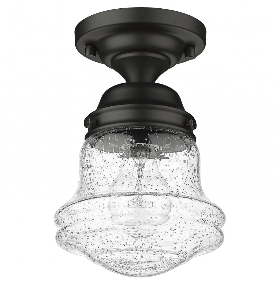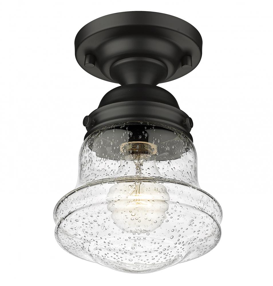 Give your space a modern farmhouse feel or restoration aesthetic with this perfectly sized, petite single light flush mount, designed with a small yet sleek contoured silhouette and a dramatic, vintage-like matte black finish that creates a subtle metallic element to the space. A perfect addition to a compact apartment foyer or narrow hallway, this Mid-Century Modern-inspired flush mount also offers an artisan quality with a clear seedy glass globe that presents an old-world charm and texture. Mount this small transitional flush mount within a sophisticated yet rustic country setting, elevating the interior with contrasted luxe materials.