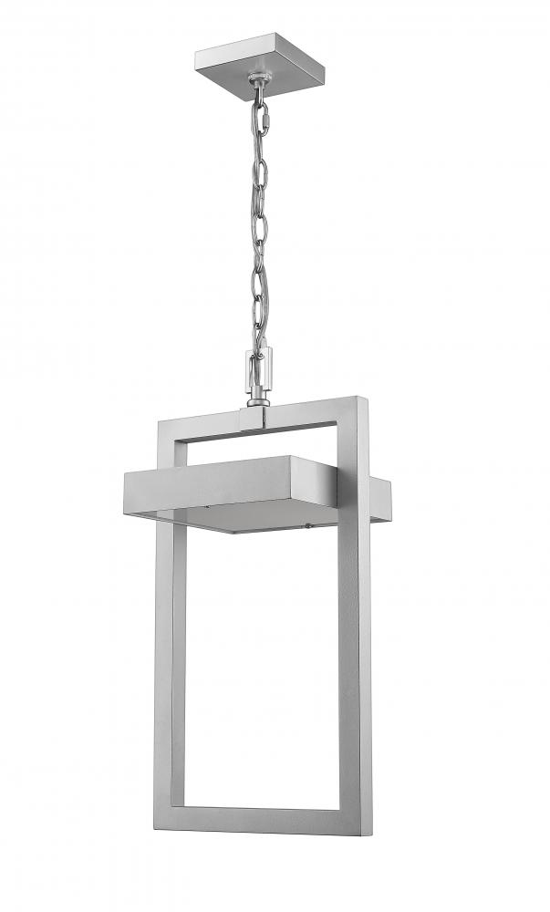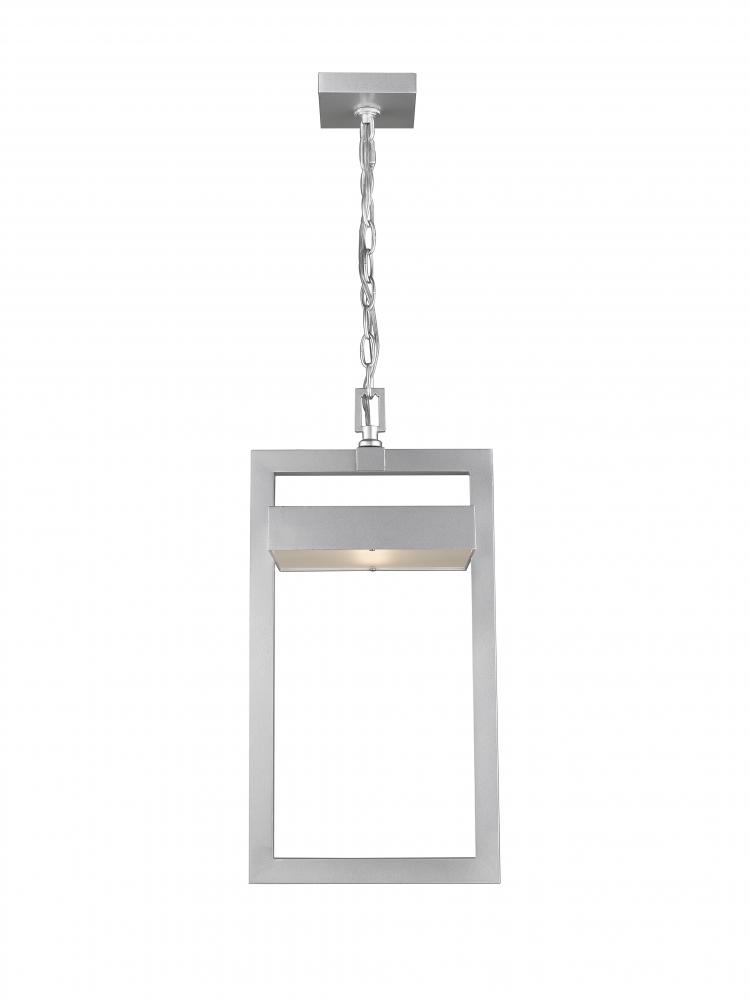 Sensual silver brings a perfect finish to the rectangular aluminum frame of this one-light outdoor chain mounted ceiling fixture. Enjoy soft lighting through a frosted glass shade and the benefits of energy-saving LED technology.