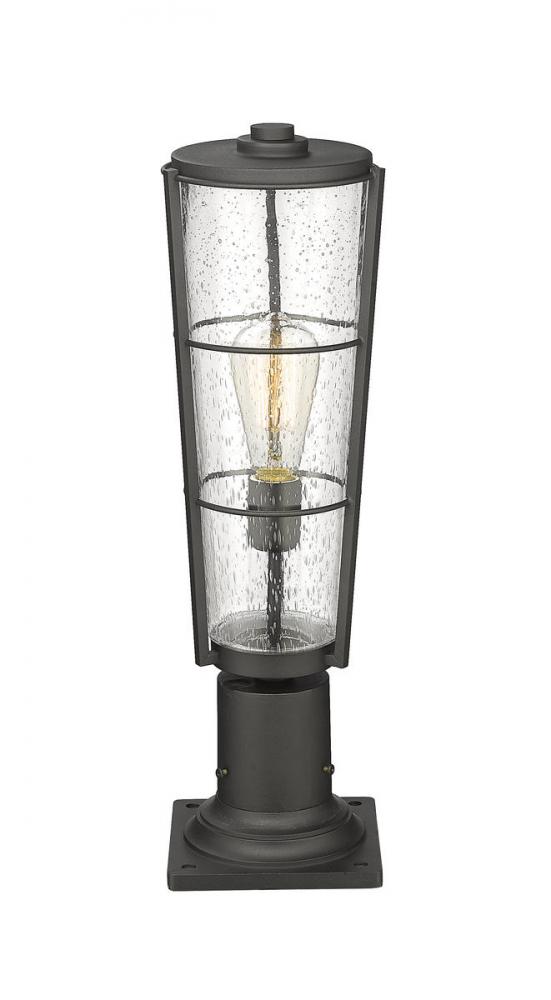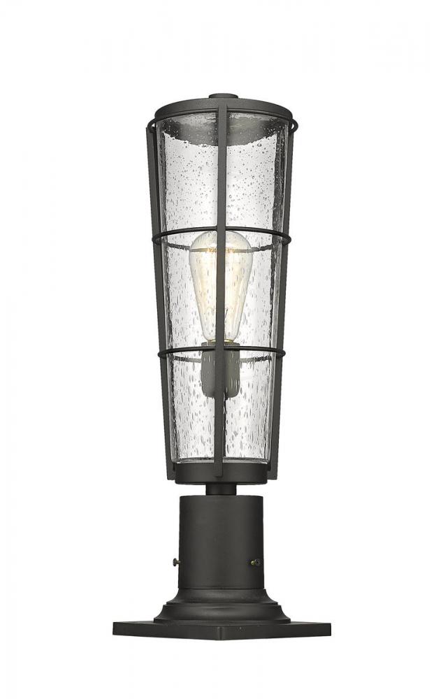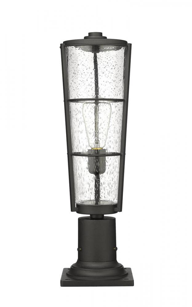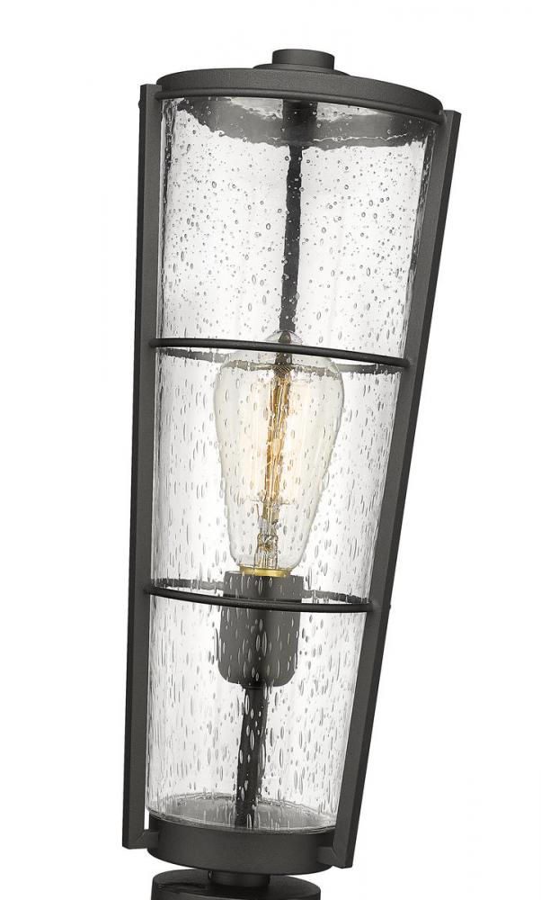 A contrasting blend of bold matte black hand-worked aluminum and romantic clear seedy glass shapes up any outdoor space, making this one-light pier mounted fixture a decorative boost to gardens and walkways. This light fixture from Helix adopts a lantern-inspired look with vintage charm, introducing a village theme.
