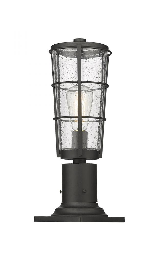 Vintage charm goes modern with this lantern-inspired outdoor pier-mounted fixture. This single light fixture from the Helix collection delivers a sleek look with hand-worked black finish aluminum and a gorgeous shade made of clear seedy glass. Let this elegant pier-mounted fixture bring classic sophistication to a custom garden space or walkway.