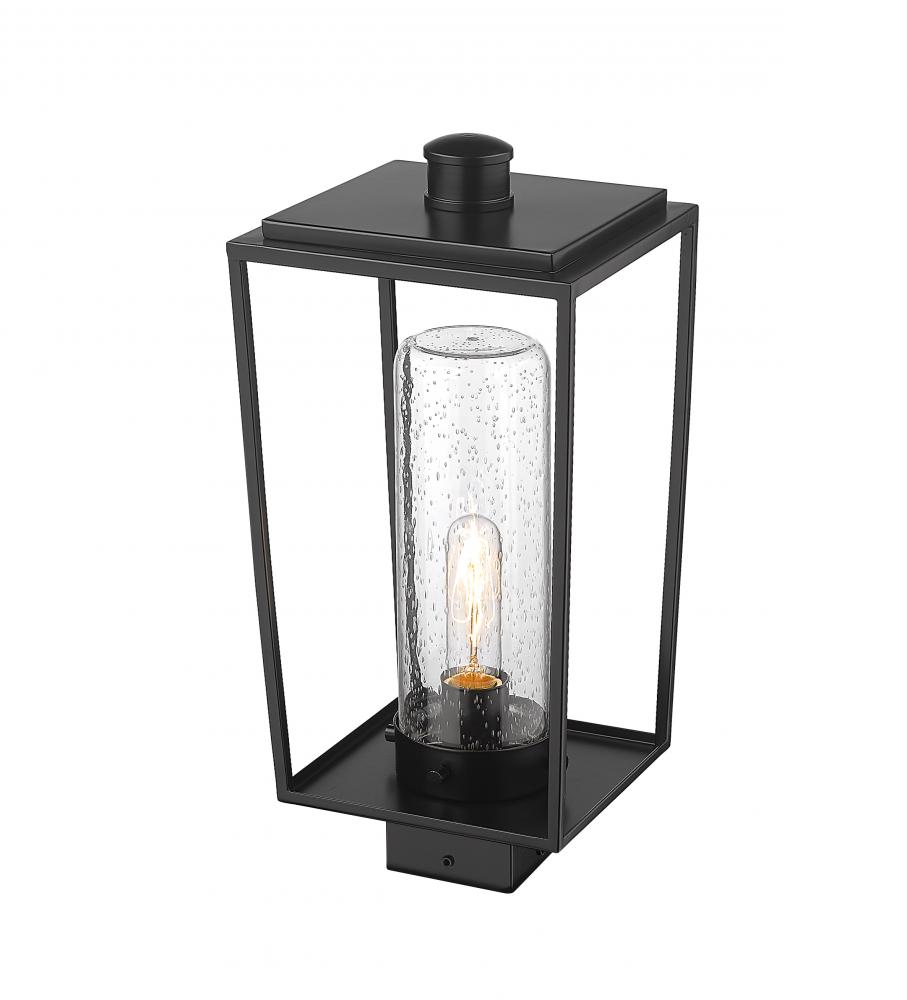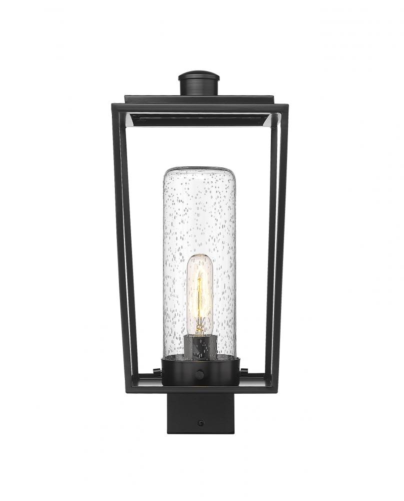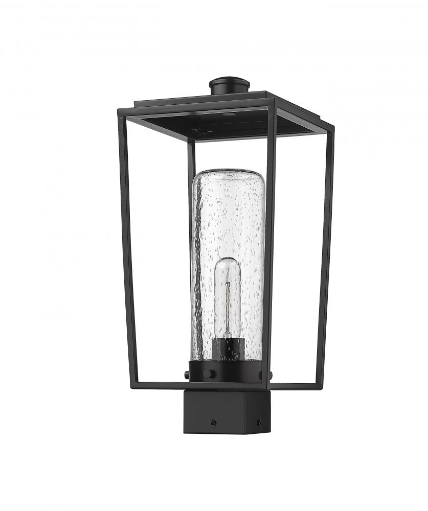 This one-light outdoor post mount fixture creates a fresh, stylish updated village motif as it provides a superb replacement to top an existing post. Embrace a romantic lantern silhouette in an open frame fashioned of black finish aluminum & steel, admiring a delicate seedy glass cylinder shade nestled within. Weather-resistant materials offer confidence for placing this fixture in a variety of regional settings.