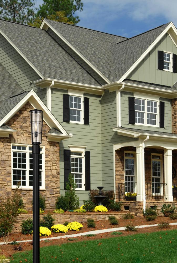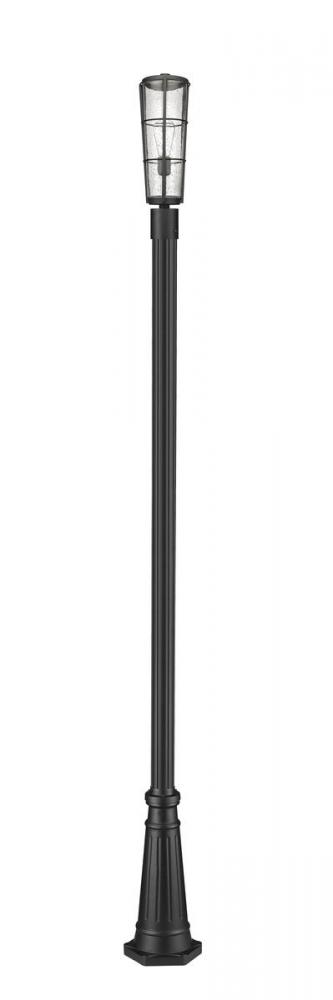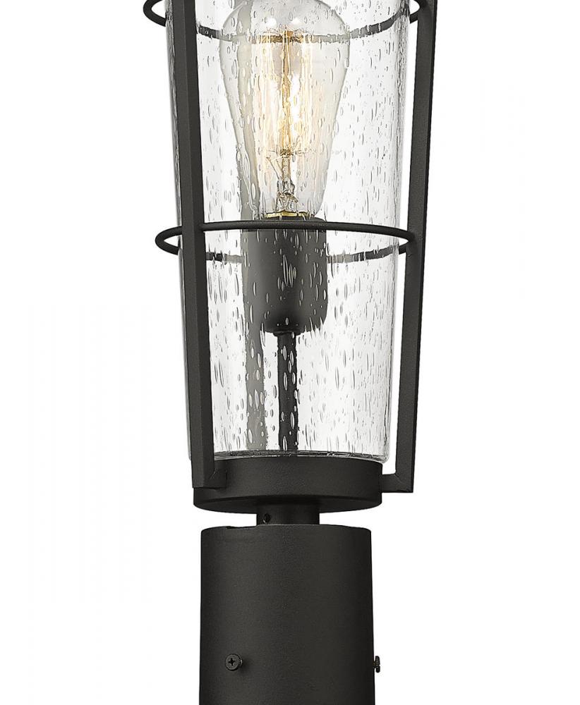 The slender silhouette of this one-light outdoor post-mounted light delivers a sense of sophistication perfect for a custom exterior space. With a post and light frame made of hand-worked black finish aluminum, this light from the Helix collection reflects a narrow lantern motif with an ornate base and a romantic conical shade made of clear seedy glass.