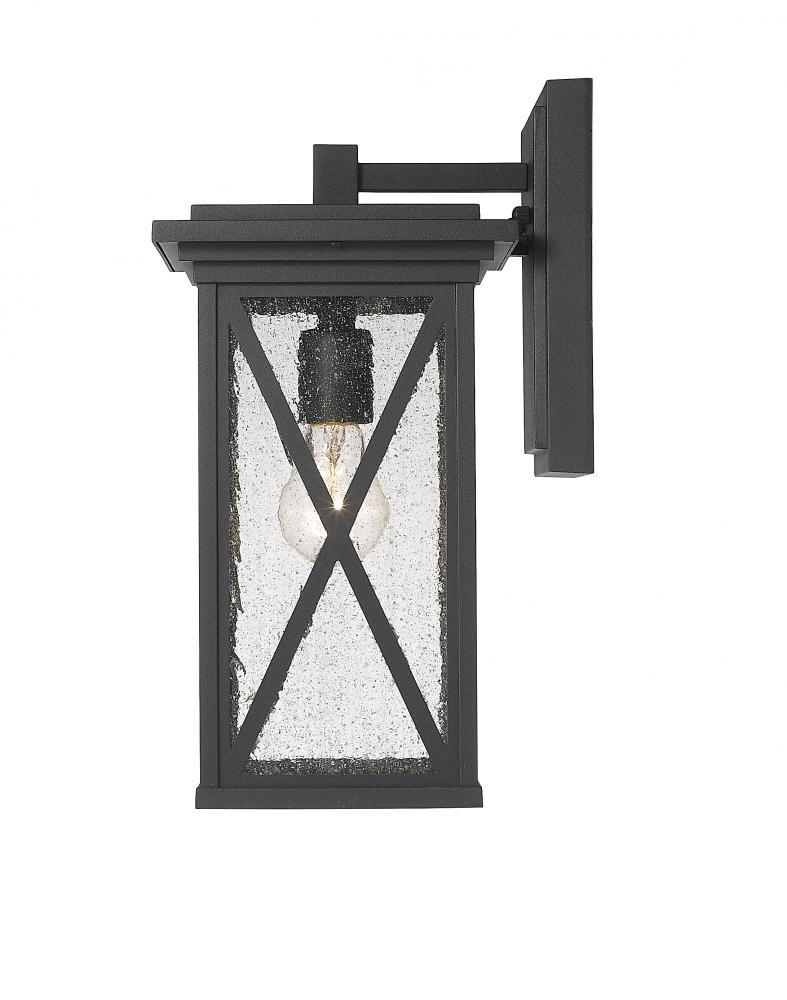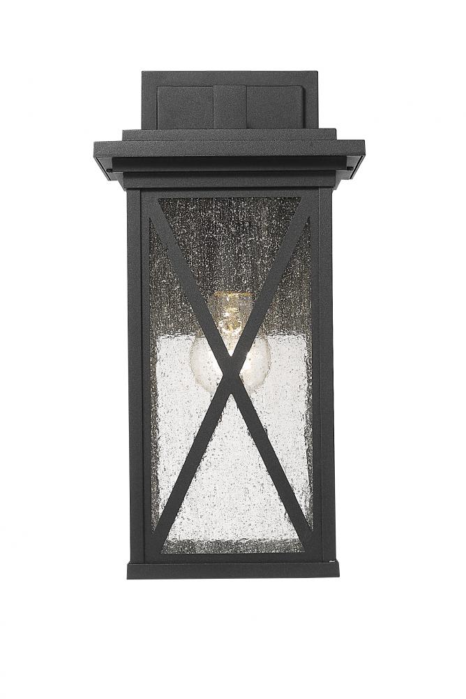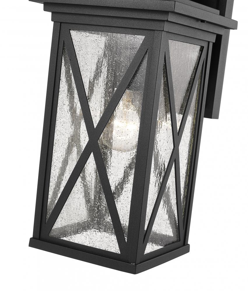 This one-light outdoor wall sconce comes in a box-shaped black aluminum cage with a clear seedy glass finish that softly diffuses light to provide a welcoming glow to your front entrance or patio. Compelling X-accents bring dimension and character. Perfect for offering an optimal lighting source targeted for your outdoor needs.