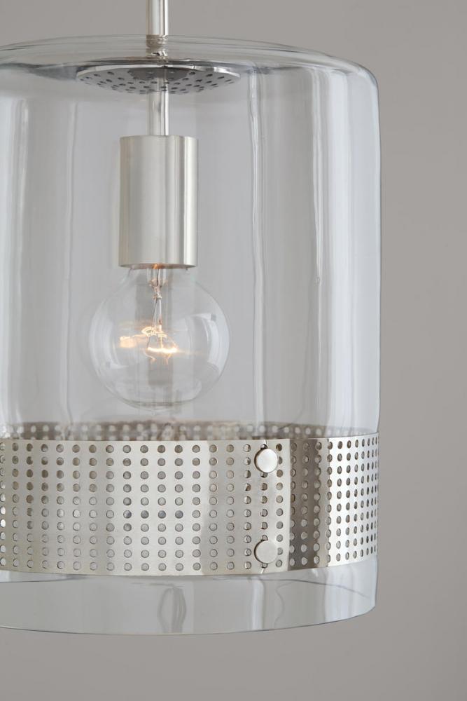 Metal and glass come together in this versatile pendant light featuring a perforated band in Polished Nickel accentuated by decorative rivets. Try a trio over the island, a pair flanking the bed or add pop to an overlooked space such as the laundry room or closet with a single pendant.