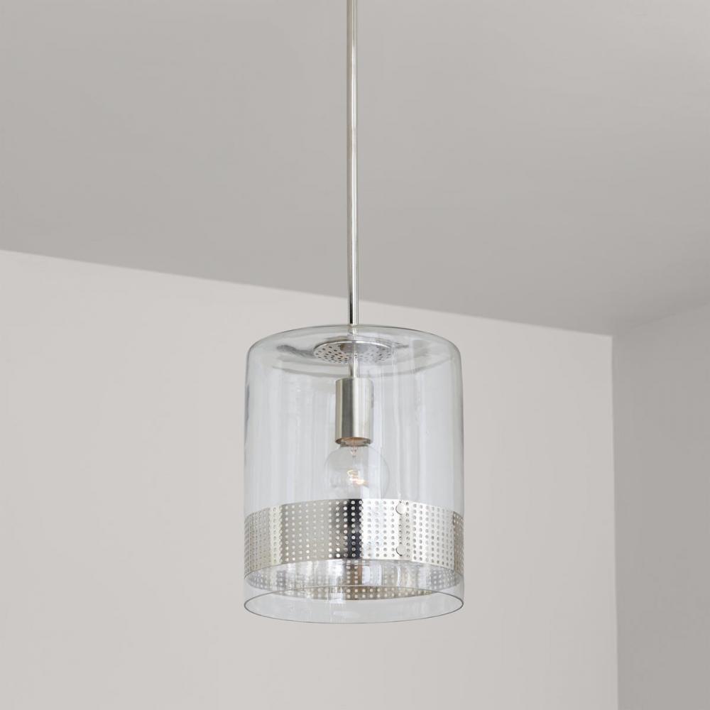 Metal And Glass Come Together In This Versatile 1-Light Pendant Featuring A Perforated Band In Polished Nickel Accentuated By Decorative Rivets. Try A Trio Over The Island, A Pair Flanking The Bed Or Add Pop To An Overlooked Space Such As The Laundry Room Or Closet With A Single Pendant.