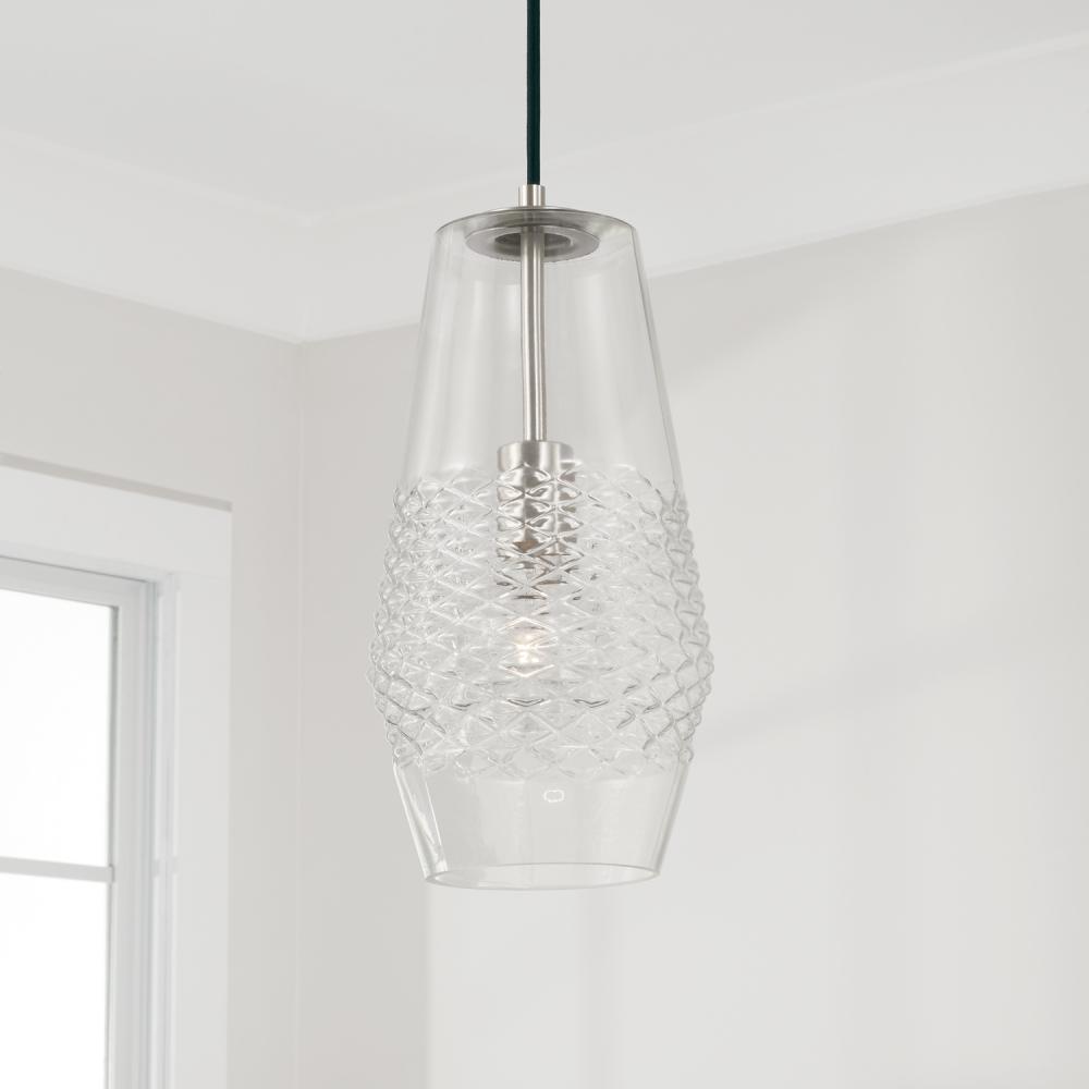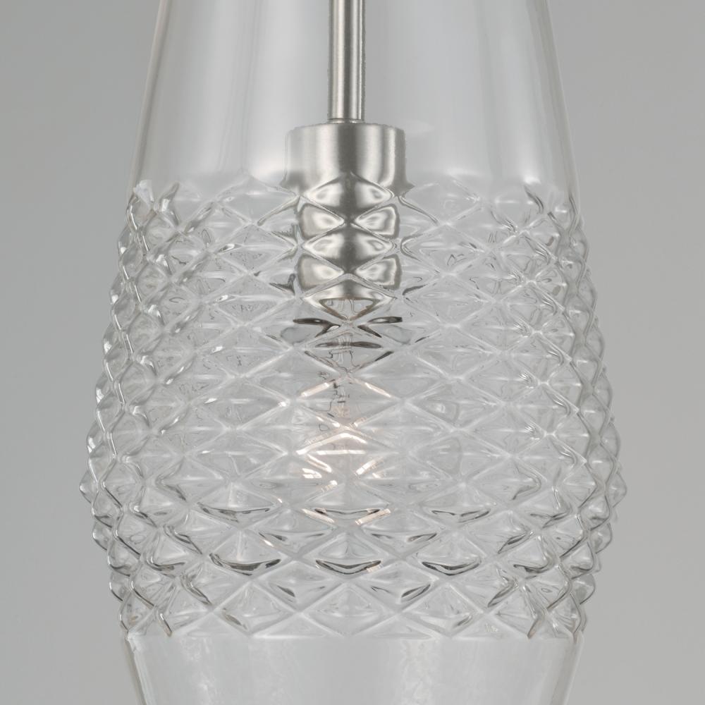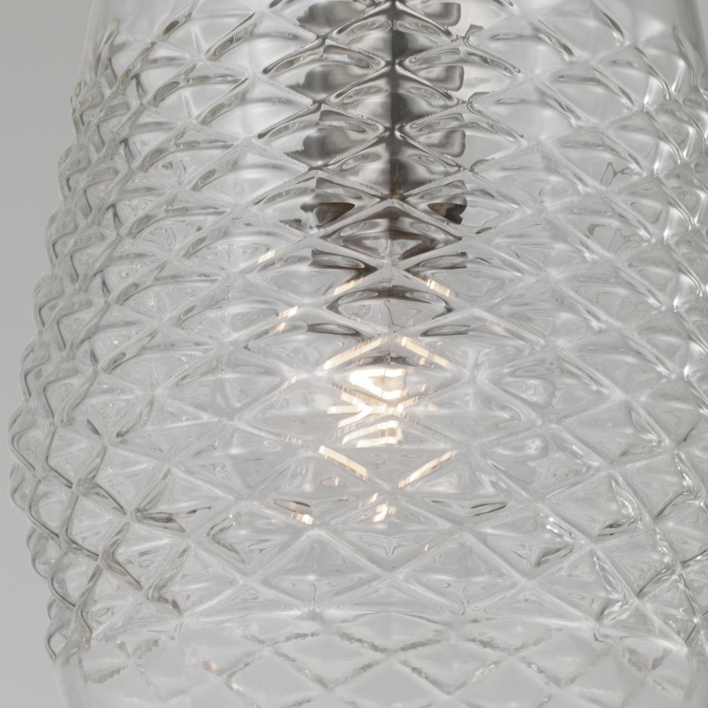 Reminiscent of heirloom glassware, the Dena Pendant brings a retro revival to any space. The diamond embossed glass paired with Brushed Nickel gives a look that sparkles and shines.