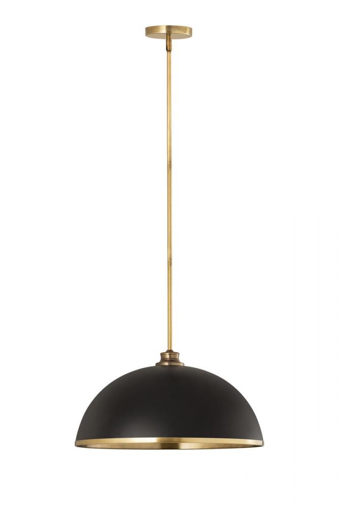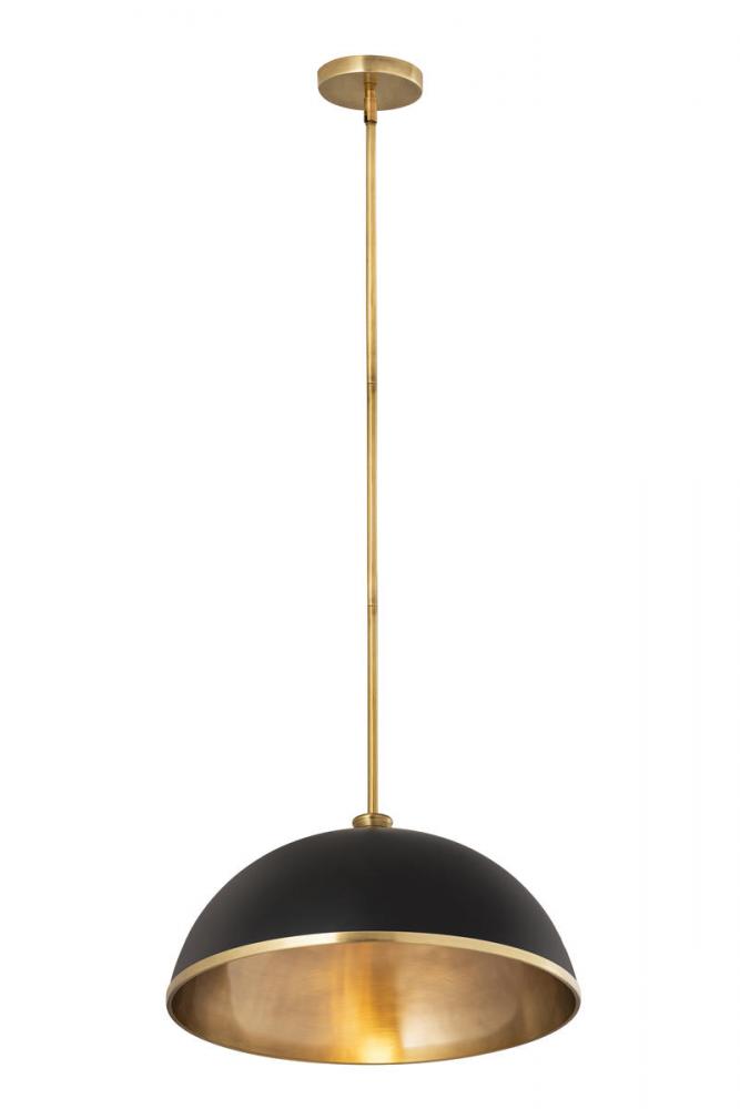 Sleek style takes on a modern look in this domed one-light pendant, a perfectly versatile way to illuminate a contemporary dining room, kitchen, or main living area. This pendant reflects myriad motifs including farmhouse, urban, and industrial, and brings simplicity with tasteful aesthetics. Crafted of matte black finish stainless steel, its accenting rubbed brass finish edge trim, down rod, and canopy deliver a decadent look.