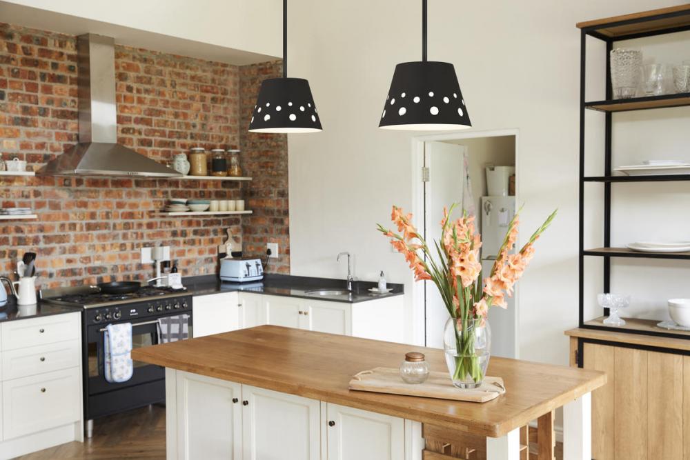 The festive design of the Katie one-light mini-pendant offers inspiring attitude to dress up a casual space. Crafted of matte black finish iron, this delightful fixture features a sleek conical shade with cutout holes that let light shine through. Punctuate a favorite dining space, kitchen, or nook with this pendant that offers adjustable hanging lengths and may be mounted on a sloped ceiling.