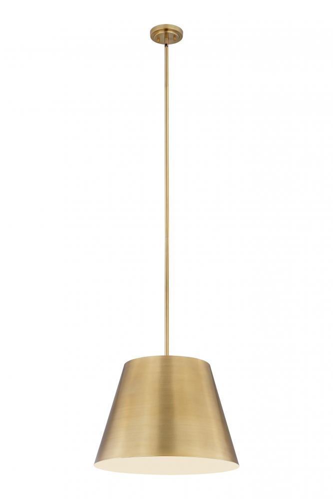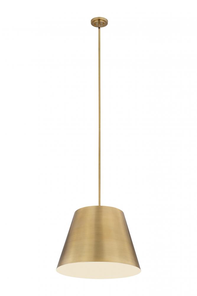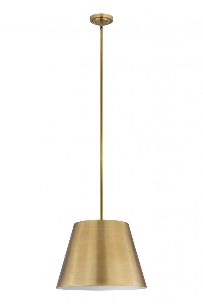 Bright, direct illumination radiates beautifully from a modern one-light pendant with a metal shade. The contemporary empire silhouette is exceptionally versatile as it offers a rich rubbed brass finish and a white interior for excellent lighting in any setting.