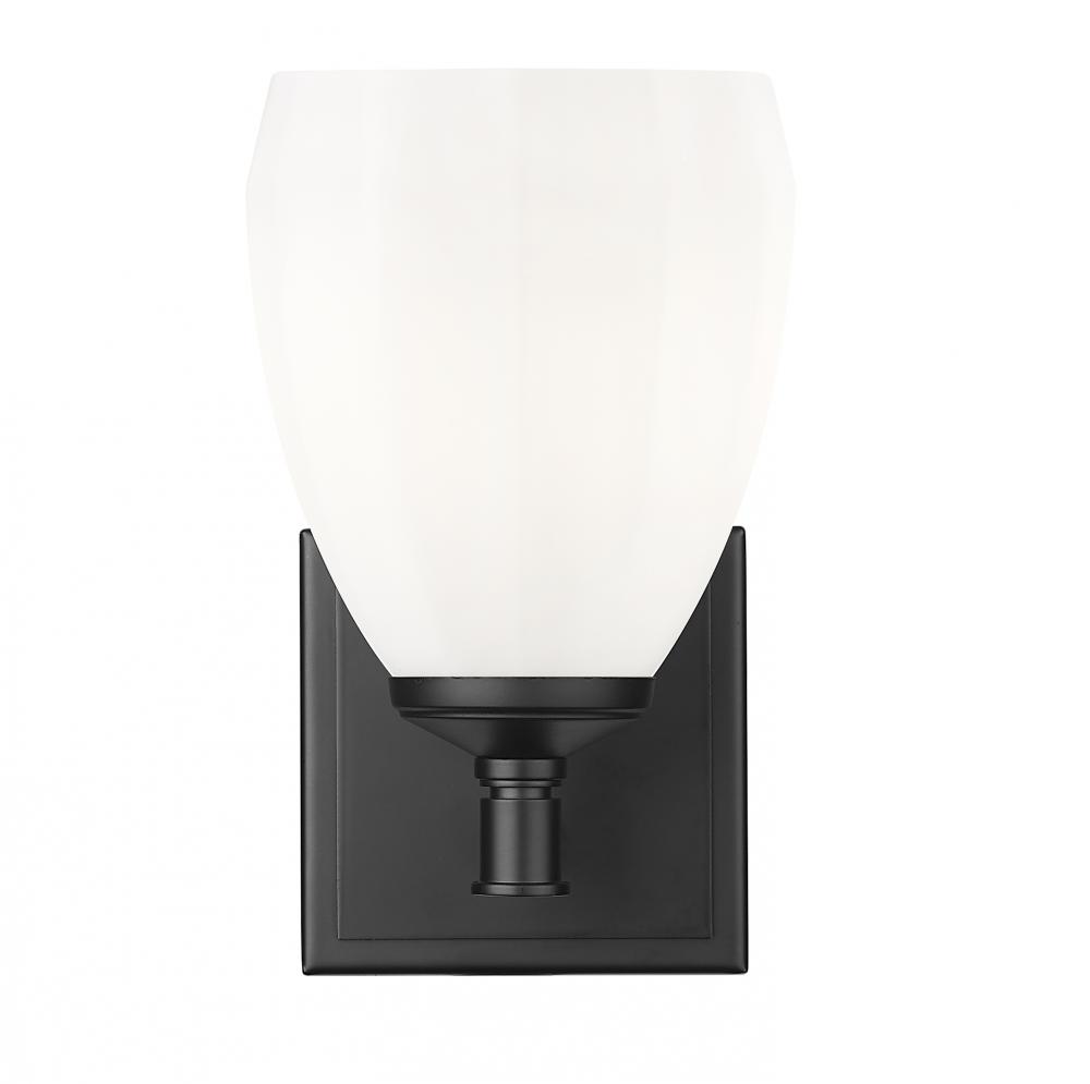 Cool matte black creates optimal contrast and depth for this modern one-light vanity sconce. It showcases a gorgeous shade of matte opal glass, with a tulip silhouette and unique faceting that adds depth and dimensionality. This charming sconce is right at home flanking a vanity, bath, or dressing area.