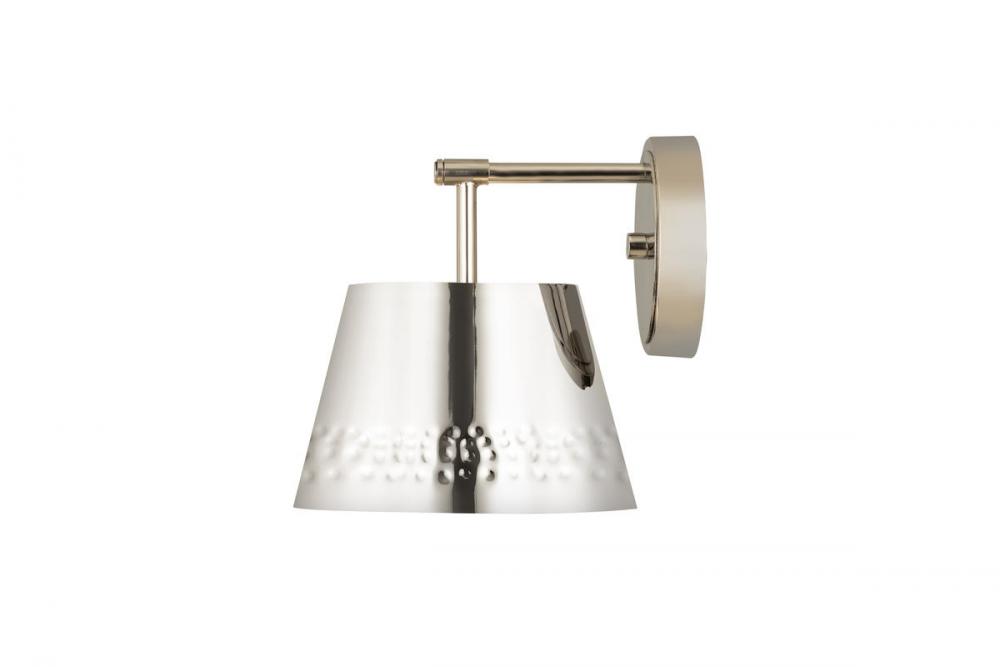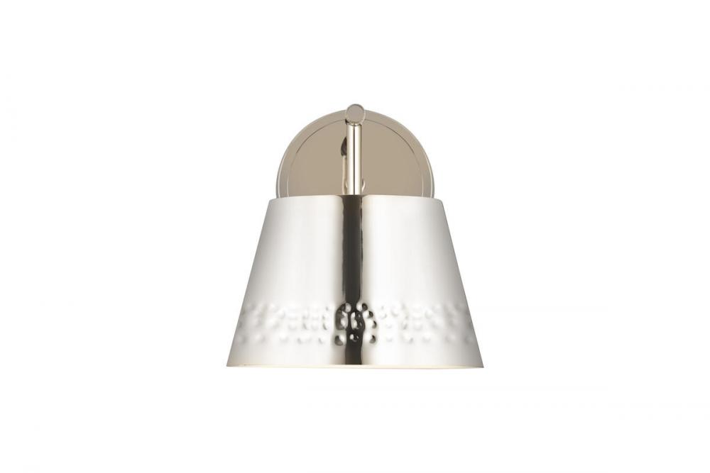 This one-light wall sconce from the Maddox collection creates a seamless, easy-living look for casual spaces in need of extra lighting. Polished nickel finish iron adds a decadent look to a sconce featuring a conical shade with a texturized hammered belt detail and matching wall mount. Dress up a bathroom or hallway space with this elegant light that incorporates farmhouse and industrial motifs.