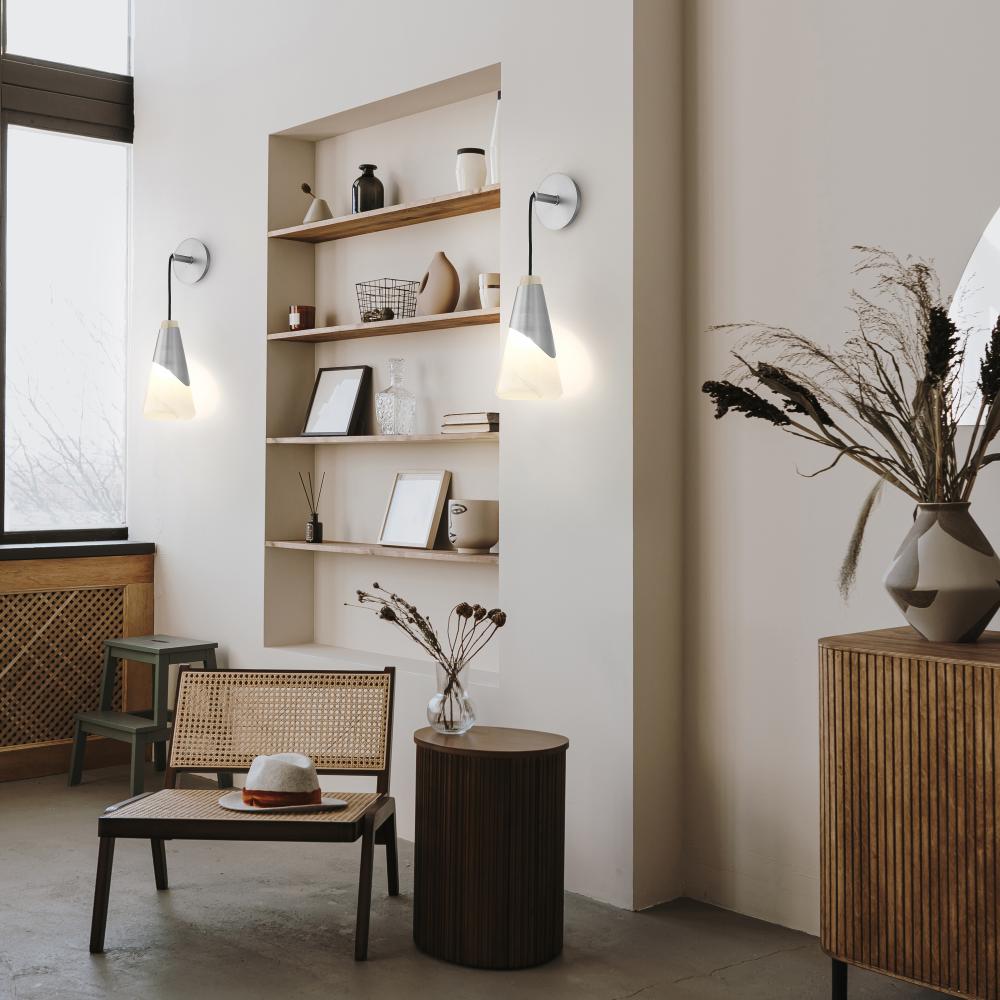 Capturing the natural beauty of melting ice, the Aimie collection boasts frosted artisanal glass in an abstract swirl pattern. A metal shroud encircles the glass shade, reducing glare while providing softly diffused light. Available in Matte Black, Brushed