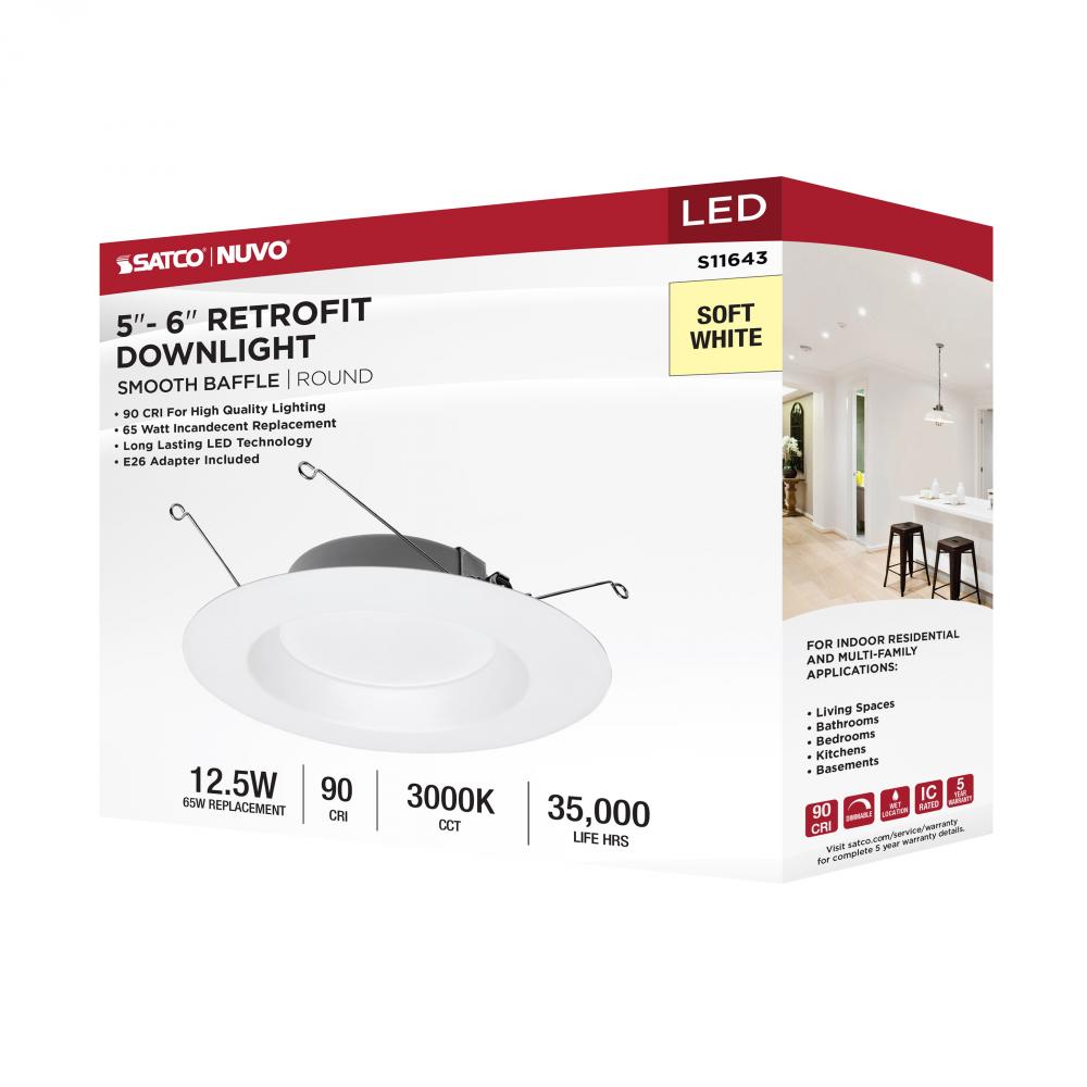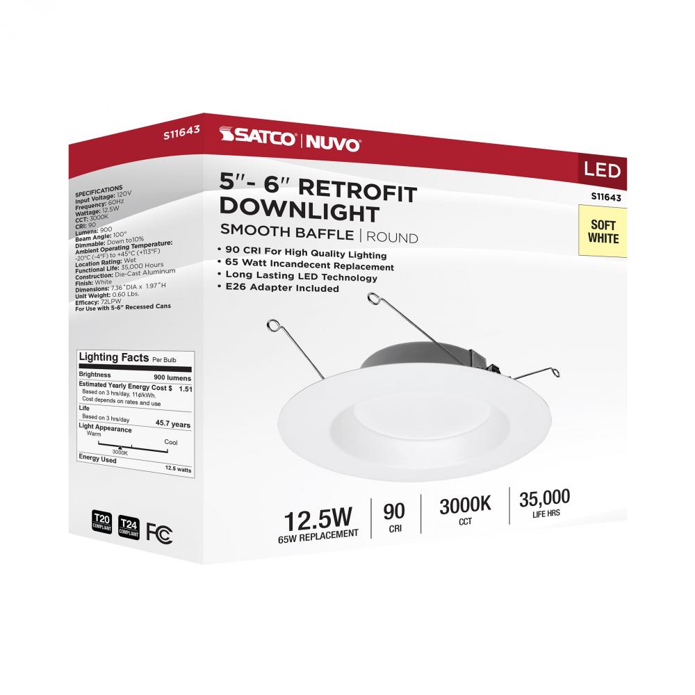 Elevate your lighting with SATCO NUVO's S11643 LED Retrofit Downlight, designed with impeccable color rendering. This retrofit is 12.5-watts with a beam spread of 100 degrees and a color temperature of 3000K, making it the perfect upgrade for existing
