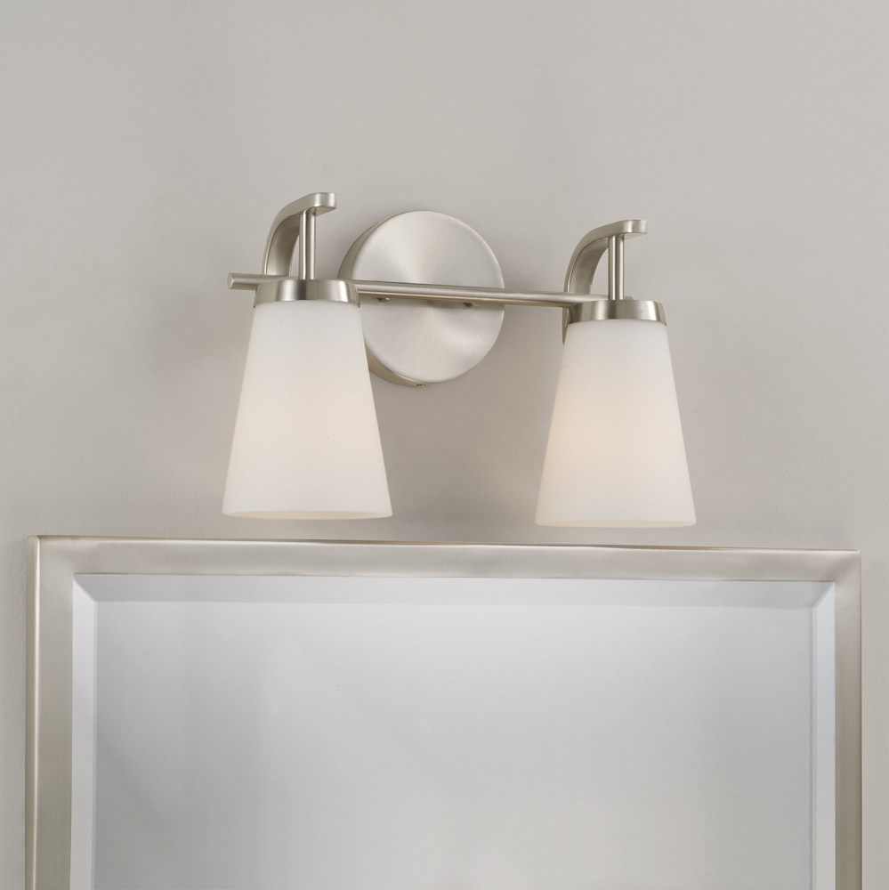 The Drake 2-Light Vanity for HomePlace brings clean and classic style to any space. Paired with sleek, intersecting arms, the tapered Soft White glass shades create an ambient glow, finished in Brushed Nickel for versatile style.
