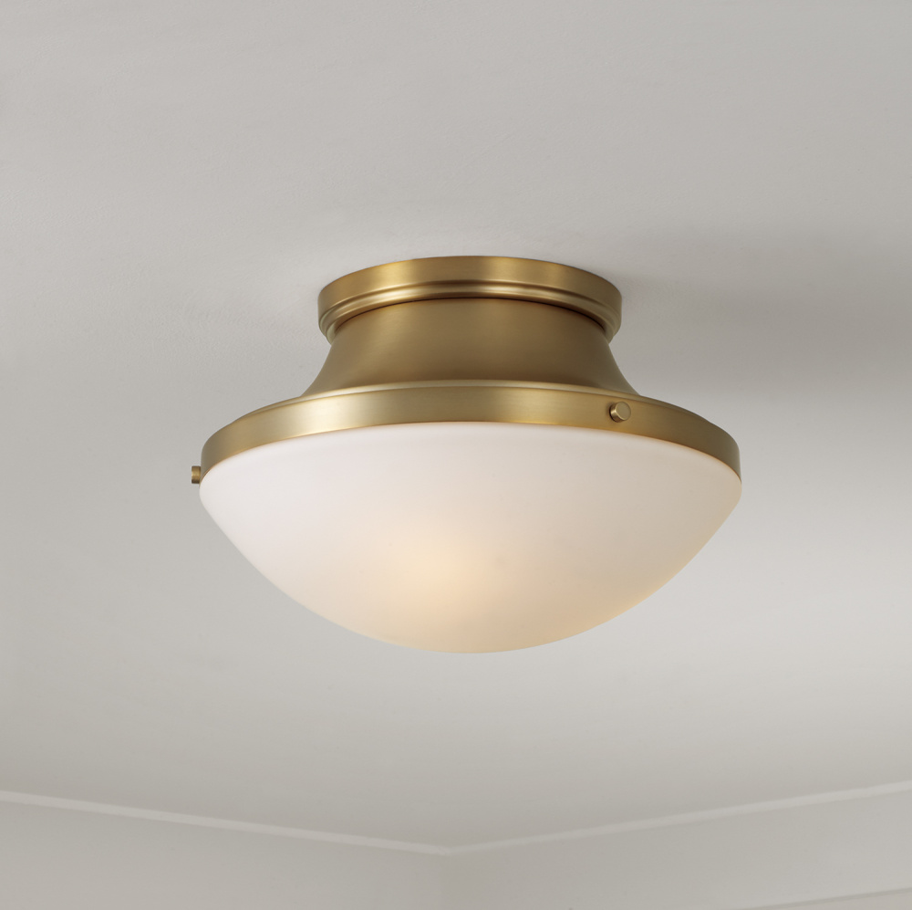 DETAILS: An Aged Brass finish and Soft White glass dome come together to form a flared drop silhouette, complete with subtle rivet details.