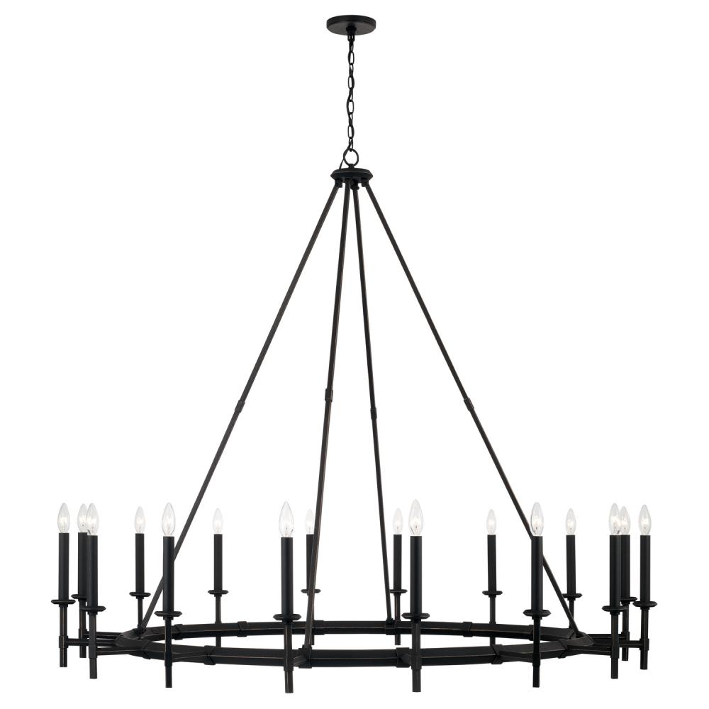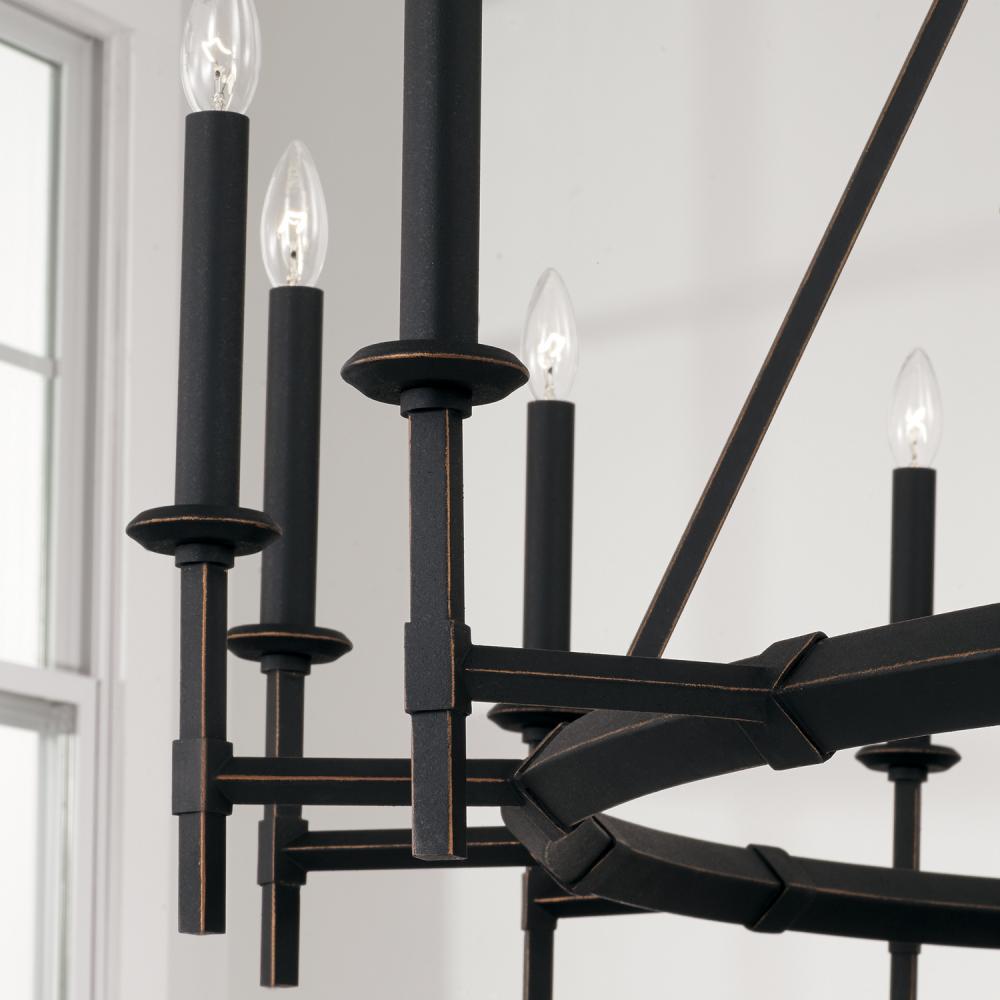 Bold and classic, the Ogden Two-Tier Chandelier brings a modern look to turn-of-the-century style. The Brushed Black Iron finish adds visual texture, and the gold highlights accent the bias angle of the ring frames.
