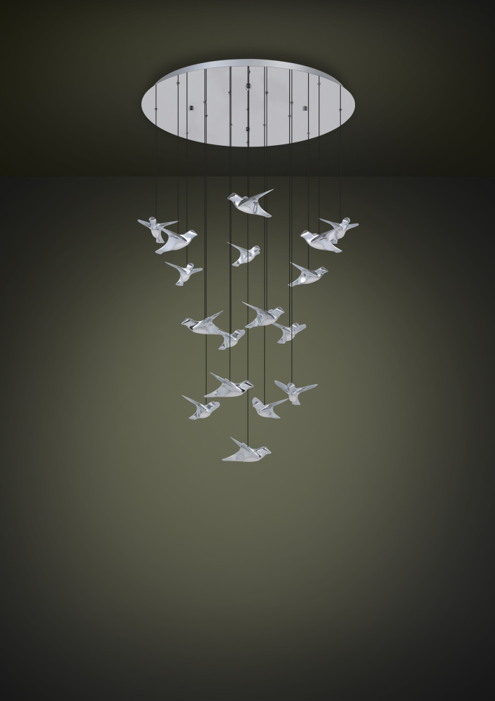 The PARATEBUENO LED cascade pendant consists of a round chrome canopy, from which 17 chrome birds are suspended on black textile cables. The integrated LEDs on the birds' bellies provide pleasant warm white light. The hanging lamp fits perfectly into modern installations and, thanks to the special suspension, is reminiscent of a mobile.