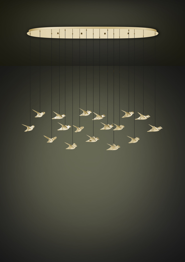 The PARATEBUENO LED linear pendant consists of a brass canopy, from which 17 gold birds are suspended on black textile cables. The integrated LEDs on the birds' bellies provide pleasant warm white light. The hanging lamp fits perfectly into modern installations and, thanks to the special suspension, is reminiscent of a mobile.