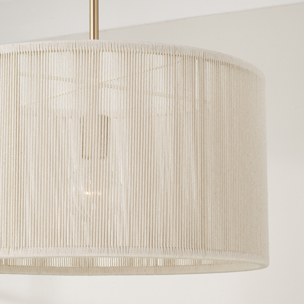 A casual twist on classic style, the Tara Medium Drum Pendant seamlessly blends a timeless silhouette with hand-wrapped Bleached Natural Rope to create a visually soft, stunning luminaire. The Matte Brass finish adds a touch of warmth and shine.