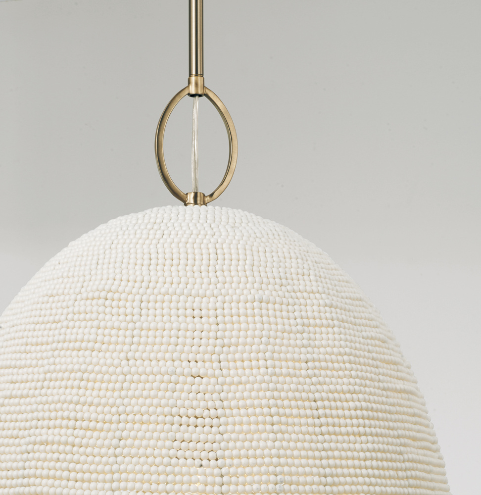 Bring a stunning display of artisan style to any space with the Natalia Medium Pendant. Beaded by hand into a beautiful dome silhouette, this luminaire strikes a delicate balance of intricate and robust. For an extra tailored touch, each fixture comes with an optional oversized loop accent at the top. Finished in Aged Brass for timeless shine.