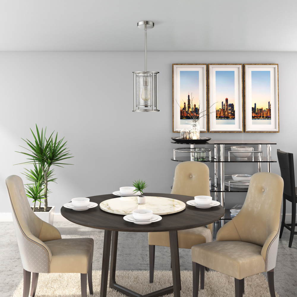 The DeVelde One Light Pendant will complement many decors. Mixing a matte nickel frame and a metal cage surrounding the light adds interest and creates a unique look to any space.