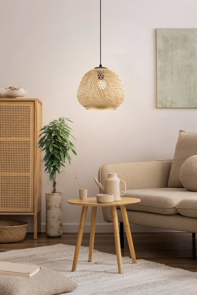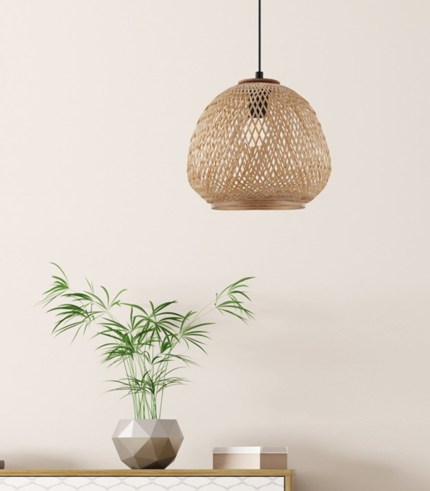 The DEMBLEBY pendant light features a black metal structure with a natural wicker lampshade. The woven pattern of the lampshade conjures up a fascinating play of light and shadow on the ceiling and wall. The pendant light blends seamlessly with trends such as vintage, natural, boho and hygge. It provides cosy lighting for any space, whether in the kitchen, in the living room or above the table in the dining room