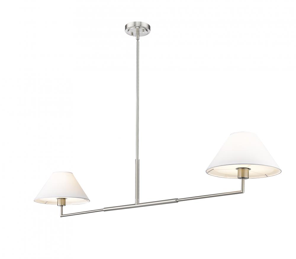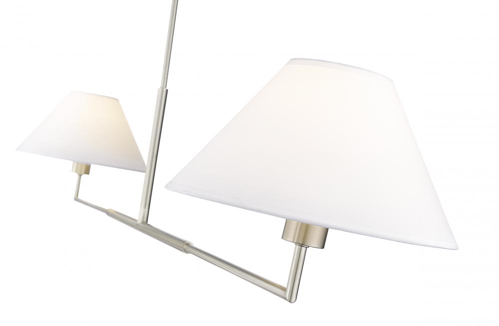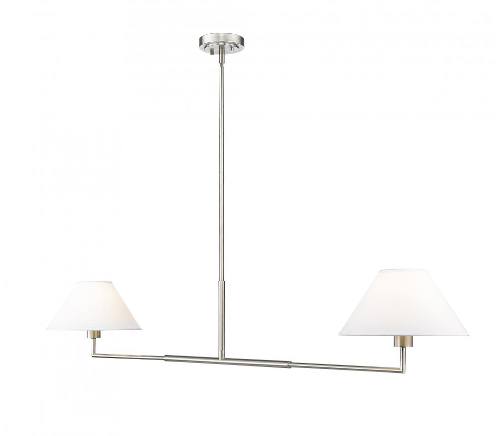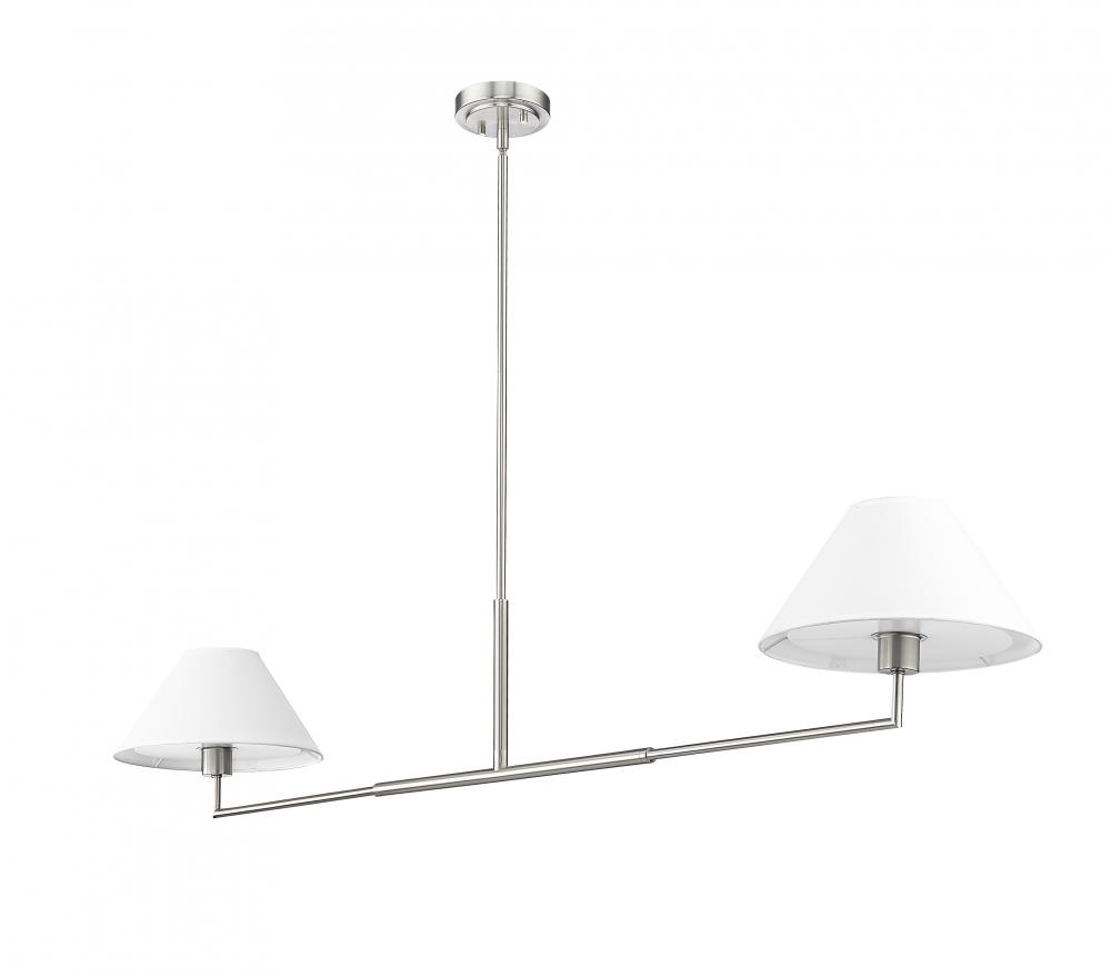 Highlighting modern simplicity and elegance, this chic two-light linear chandelier is stunning over a kitchen island or spanning a living room seating area. Its clean lines are accentuated with a crisp brushed nickel finish over steel construction, while a pair of white linen empire shades are beautiful and timeless in any room. Casting inviting illumination for tasks and ambiance, this chandelier is a stylish fit in myriad spaces.