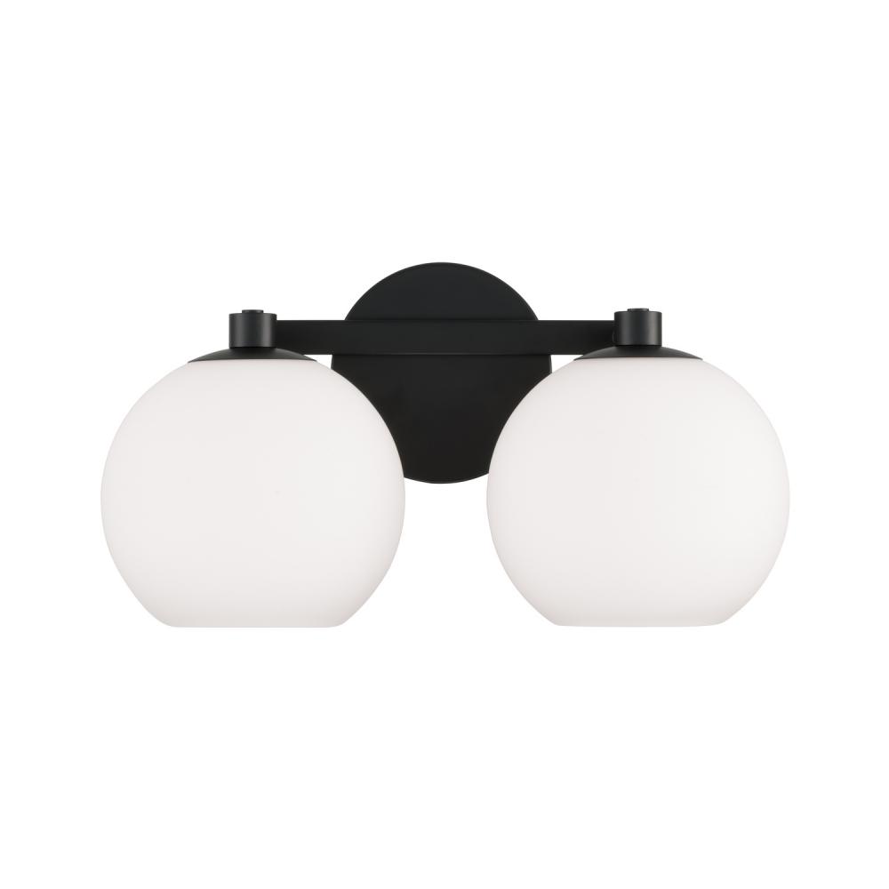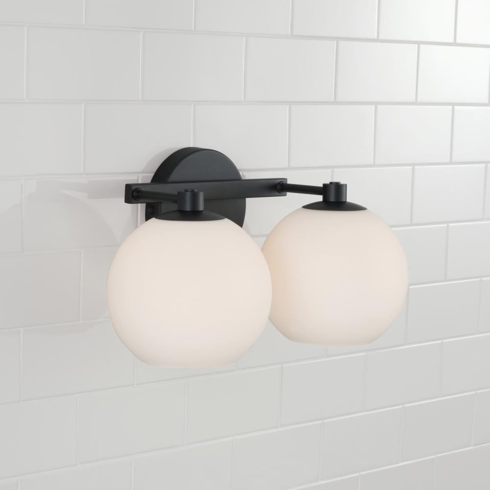 Circular forms meet all-around versatility in the Ansley 2-Light Vanity for HomePlace. The Soft White glass globe shades illuminate sophisticated style, while the Matte Black finish creates a sleek contrast.
