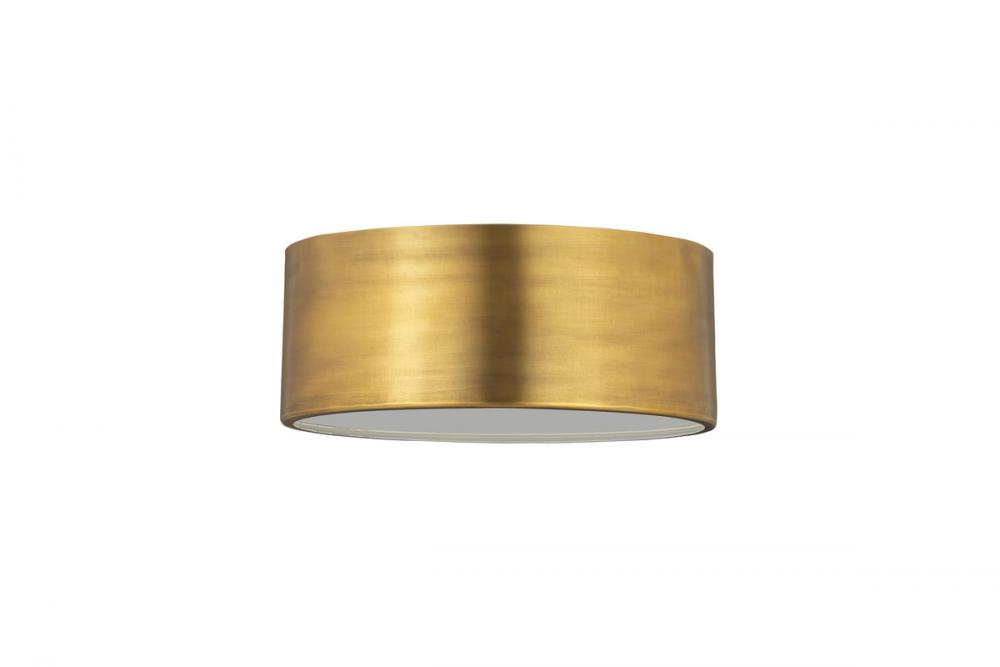 Elegant simplicity offers a minimalist design that captures attention, making this contemporary flushmount metal drum two-light ceiling light a versatile selection. This light from the Harley collection is perfect for casual, easy living spaces, offering a sleek large-form silhouette with a shade made of warm rubbed brass finish steel. Bring industrial-inspired vibes to a kitchen, dining space, or hallway with this tasteful fixture.