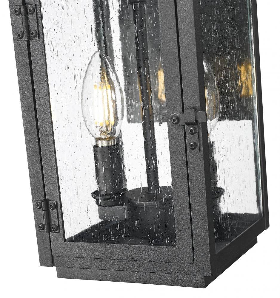 A timeless silhouette in a sand black finish brings just the right amount of mood to your entryway with this outdoor wall light. Two candle-style lights shimmer gently behind clear seedy glass, adding soft warmth and old-world charm. Its ideal for flanking doors or adding glow to cozy corners.