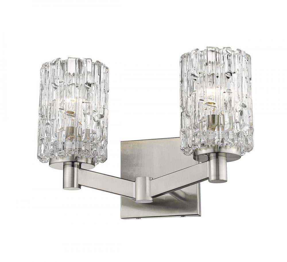 A contemporary haven is bejeweled with glam as this exquisite two-light vanity light becomes a focal point in a custom bath space. Crystal-like glass shades add an air of exclusivity to a fixture with a beautiful Brushed Nickel finish metal mount and arms, and an air of high-class, upscale elegance.