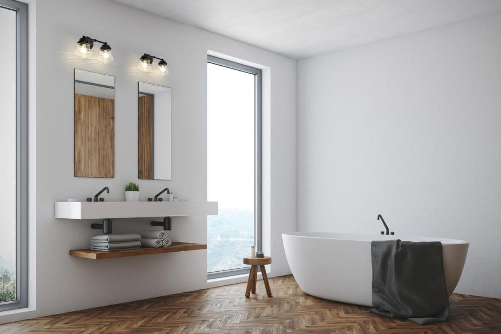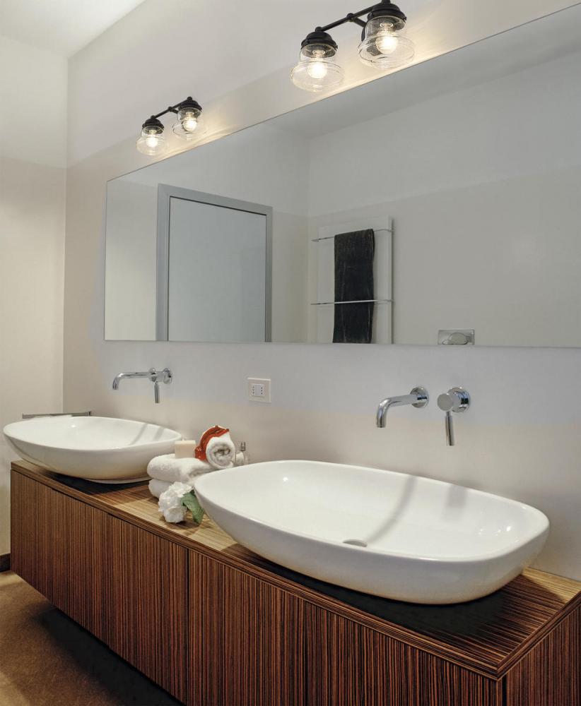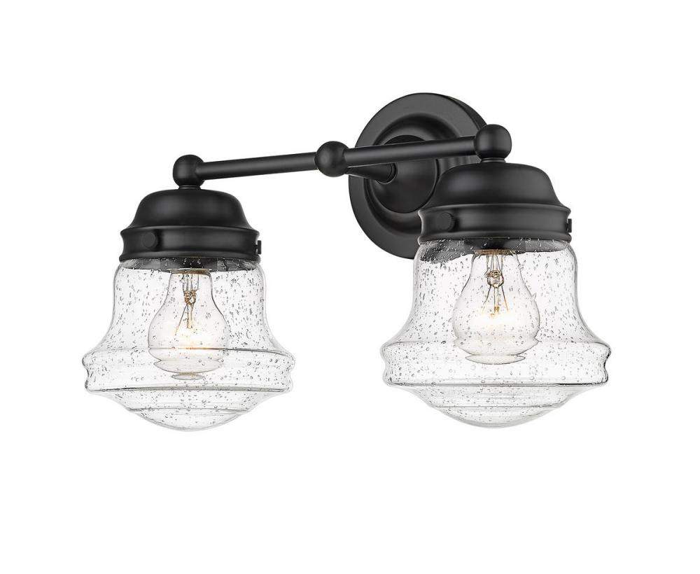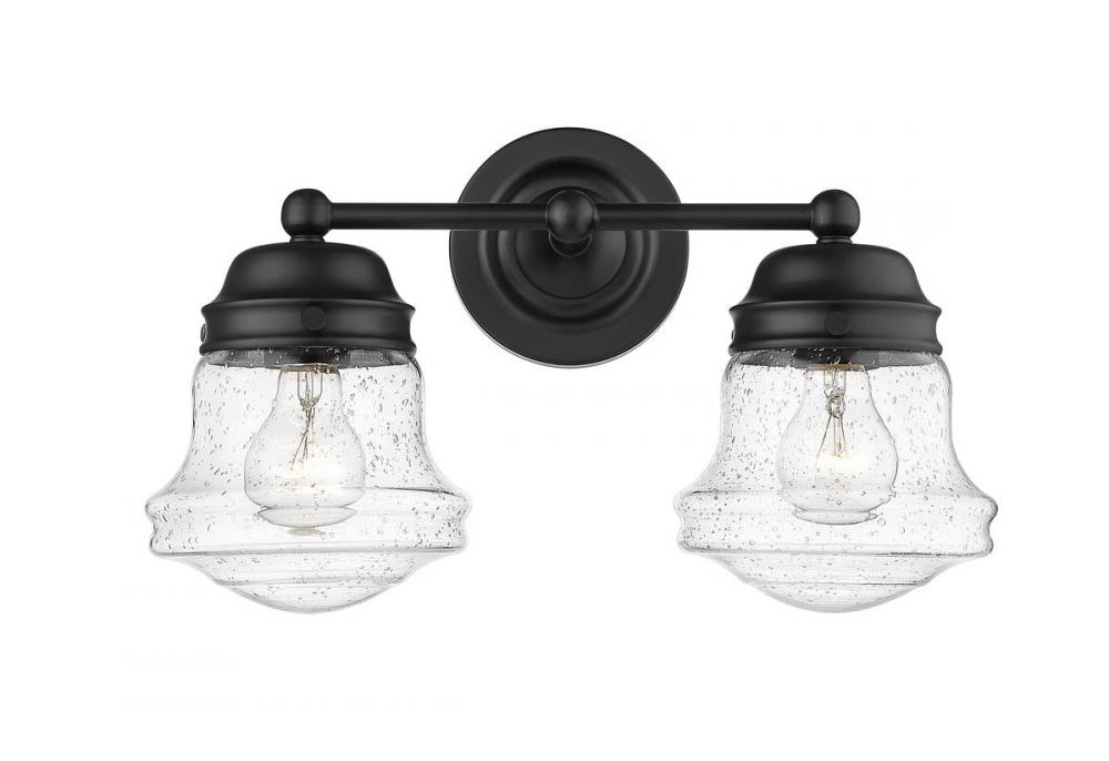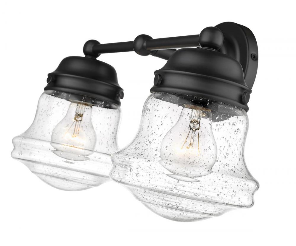 Charming, festive style goes light as it lights up a bath space with this two-light vanity from the Vaughn collection. Illuminate a compact vanity with a themed fixture borrowing from nautical and industrial, formed of bold matte black finish steel and featuring unique schoolhouse clear seedy glass shades. This light becomes a central focus in a transitional or modern bathroom.