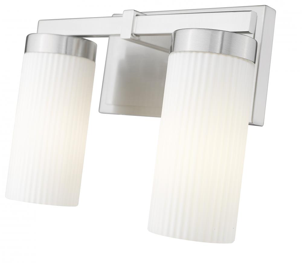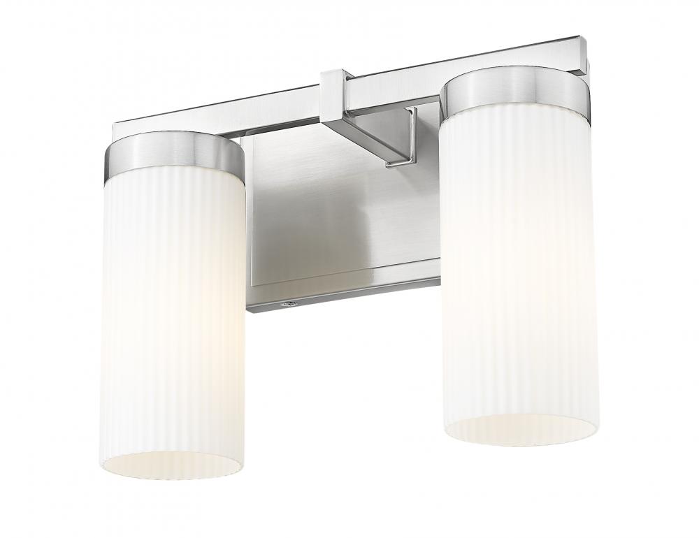 Coming in hot with a brushed nickel finish and twin ribbed glass shades, this two-light vanity delivers structure, balance, and understated charm. The rectangular backplate ties the look together with crisp lines and a tailored feel. Designed to brighten with purpose, it brings effortless refinement to any setting.