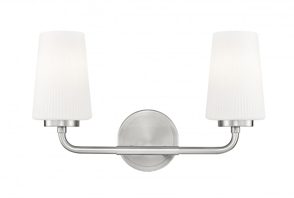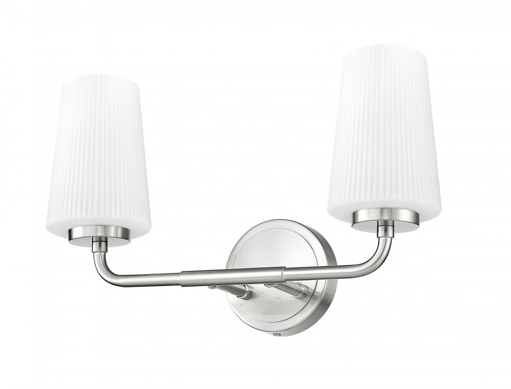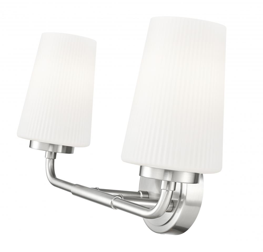 Cool and precise, the streamlined silhouette of this modern two-light vanity sconce shines with a brushed nickel finish. A pair of ribbed matte opal glass shades diffuse the light, creating a soft, ambient glow perfect for both ambiance and grooming and beauty rituals. A sleek design with industrial attitude, this wall light offers updated appeal perfect for bathrooms small and large.