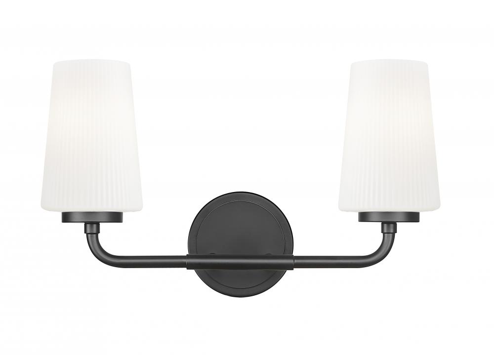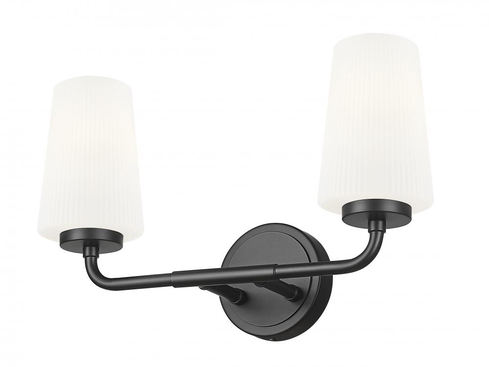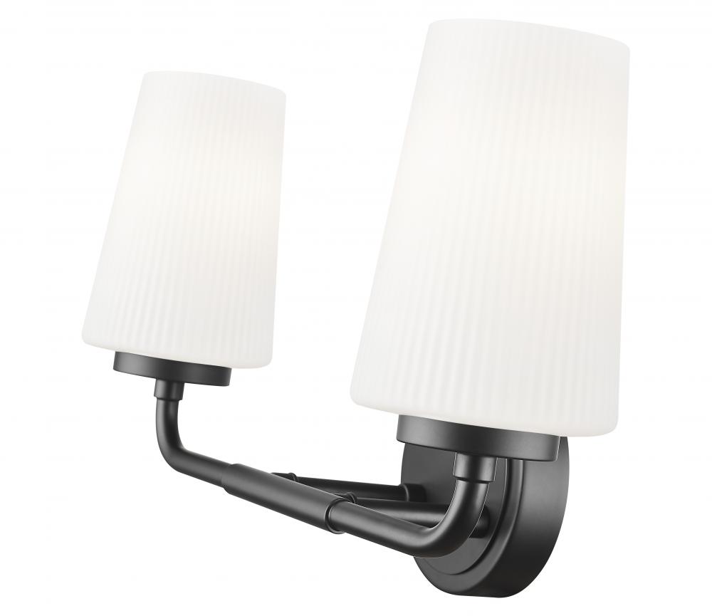 Delicate tapering and ribbed opal glass shades create a striking silhouette for this modern two-light vanity sconce. In matte black, it features a clean, refined silhouette that calls to mind industrial design influence and offers timeless character.