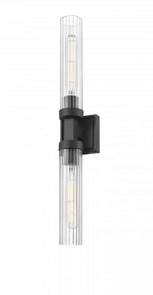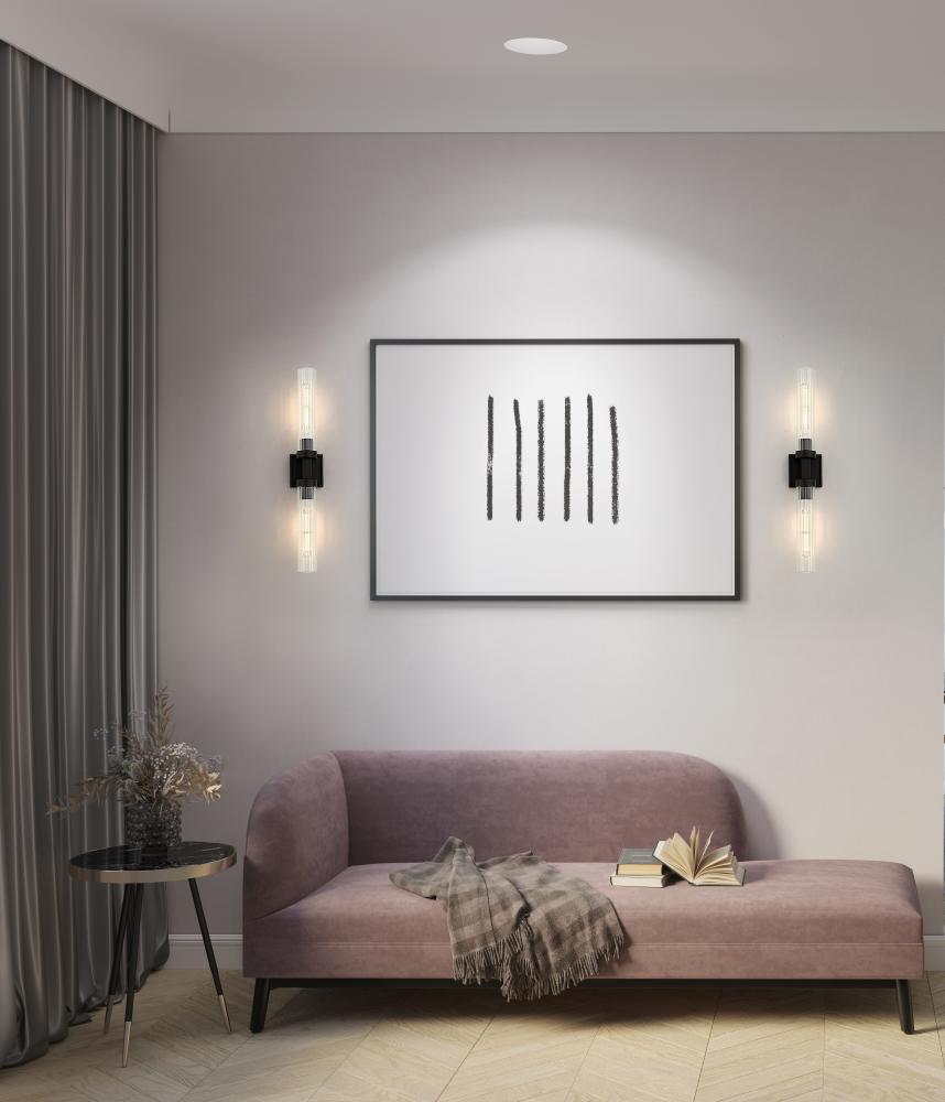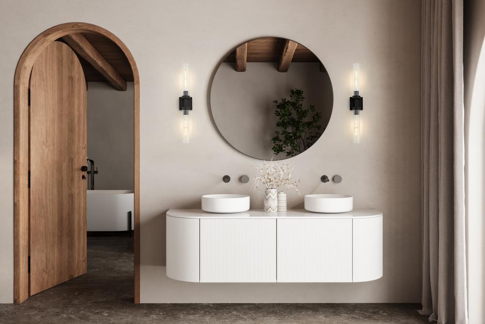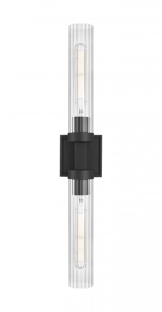 A matte black finish pairs perfectly with the delicate fluted clear glass shades featured on this modern two-light wall sconce. Designed with a linear silhouette and lights on each side of a decorative arm, it offers a refined personality in an entry or at your vanity.