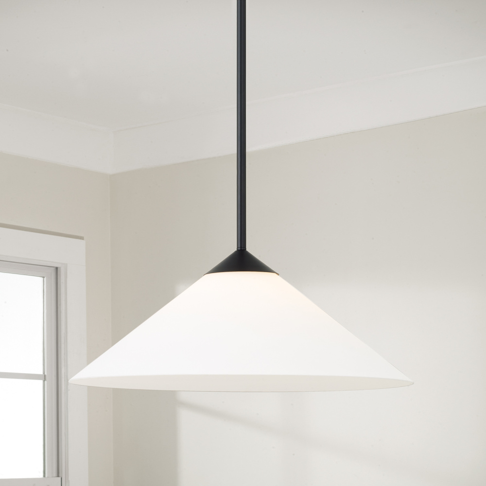 The classic cone shape gets an update with sleek lines and designer details. Paired with the Matte Black finish, the Soft White glass gives an ambient glow to the crisp silhouette of the Gatsby Pendant — complete with a tapered canopy for elevated style.