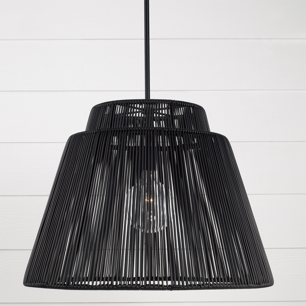 Purposefully crafted for interior and exterior spaces, the Jasper Indoor/Outdoor Pendant seamlessly blends durable design with high style. Paired with the Matte Black finish, the weather-resistant hand-wrapped resin delivers a modern aesthetic. Rated for Damp Locations and backed by our one-year warranty.