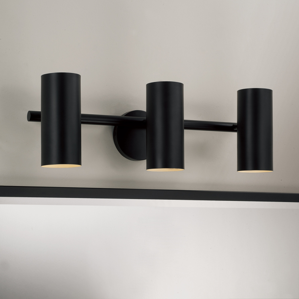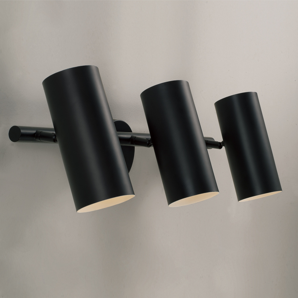 Smooth, cylindrical forms create the Robbie Vanity. Finished in Matte Black, this contemporary luminaire showcases a touch of contrast with an interior White finish. Each metal cylinder pivots to direct the illumination, bringing modern versatility to beautiful task lighting.
