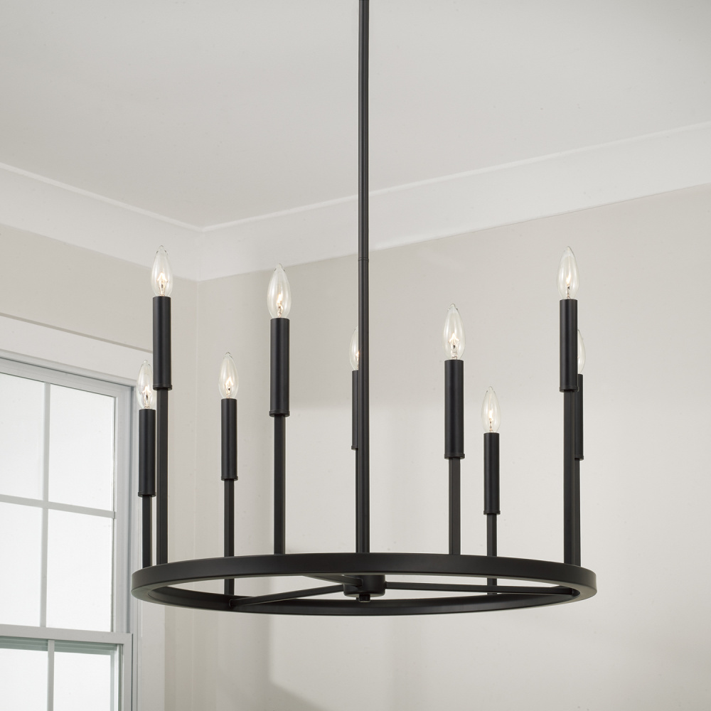 Grounded in a dark Espresso finish, the Davis 26 inch Small Chandelier creates handsome, tailored style with clean lines and a classic ring silhouette. The cylindrical candle sleeves are easy to swap with both Espresso and Brass options included for a two-tone or monochrome look.
