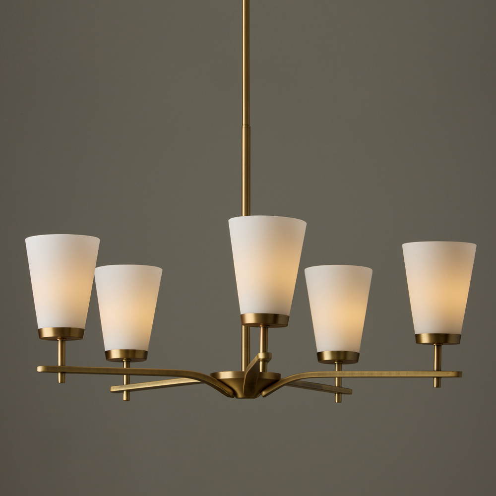 The Drake 5-Light Small Chandelier for HomePlace brings clean and classic style to any space. Paired with sleek, intersecting arms, the tapered Soft White glass shades create an ambient glow, finished in Aged Brass for sophisticated style.