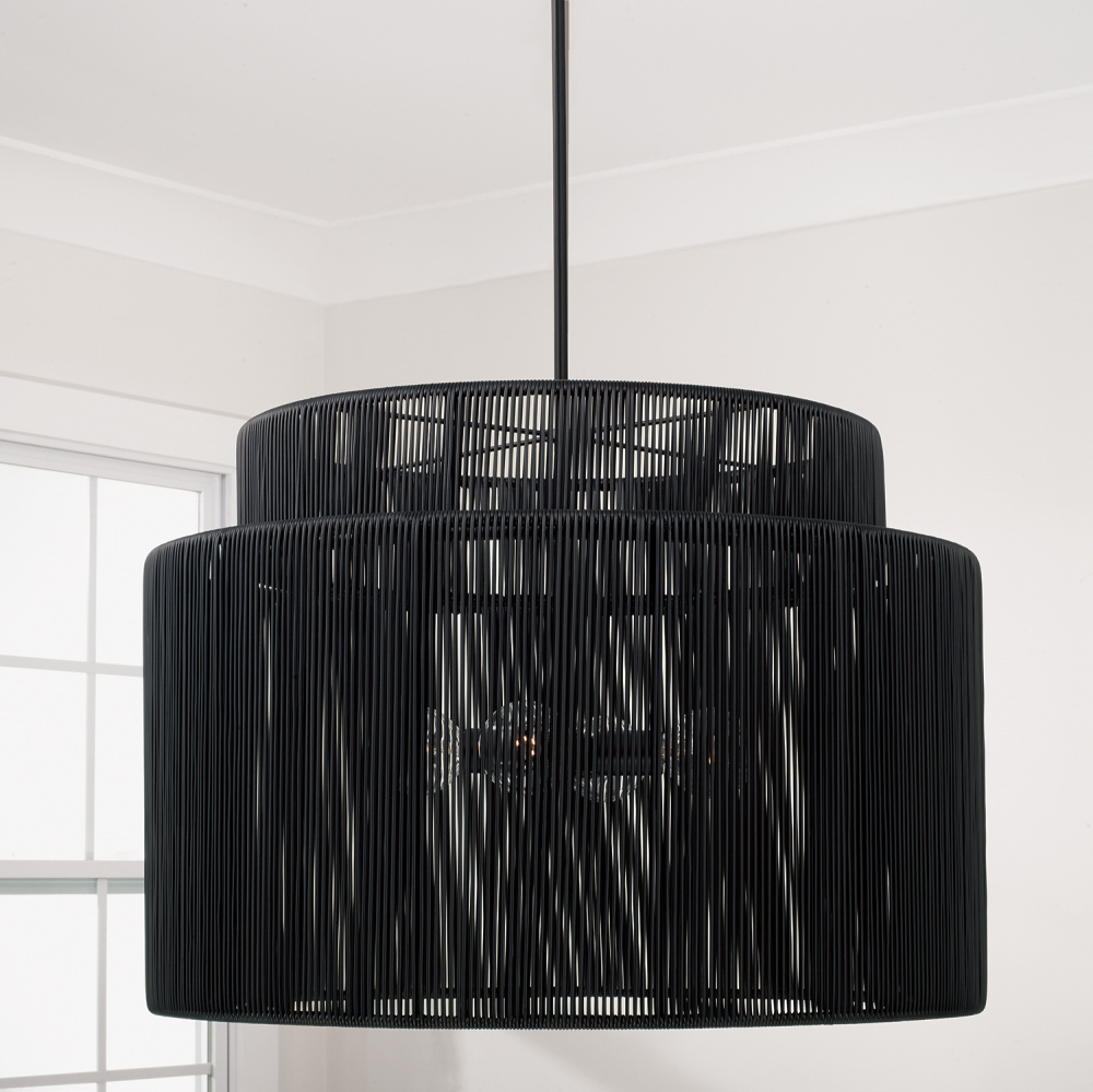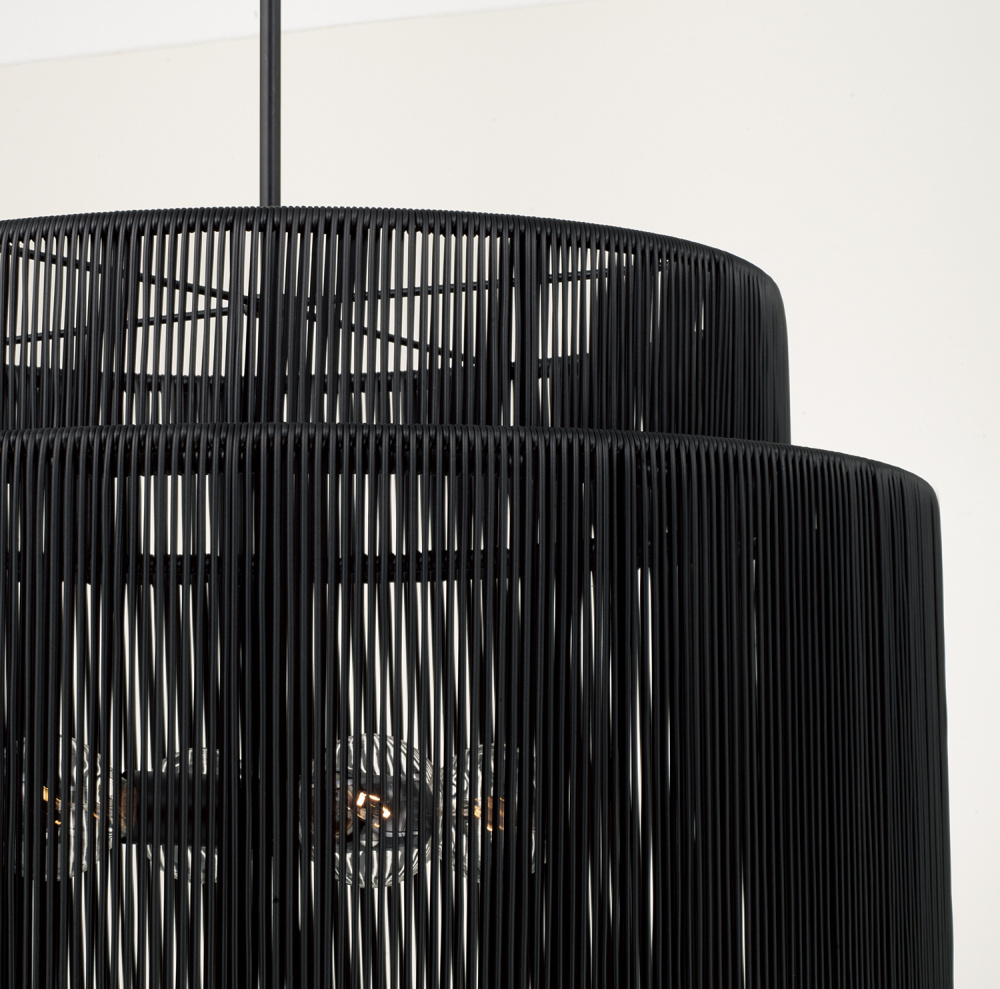 Purposefully crafted for interior and exterior spaces, the Jasper Indoor/Outdoor Large Pendant seamlessly blends durable design with high style. Paired with the Matte Black finish, the weather-resistant hand-wrapped resin delivers a modern aesthetic in a tiered drum silhouette. Rated for Damp Locations and backed by our one-year warranty.