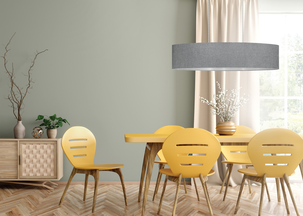 The MANDANA pendant features an oval shade made of gray fabric and a matte nickel metal suspension. The shade is combined with a silver-colored interior, skillfully rounding off the modern design. This pendant blends seamlessly into minimalist interiors and offers cozy lighting for any room—whether in the living room, bedroom, or in the dining room above the dining table.