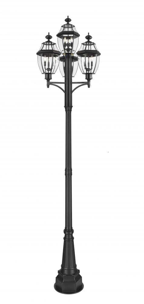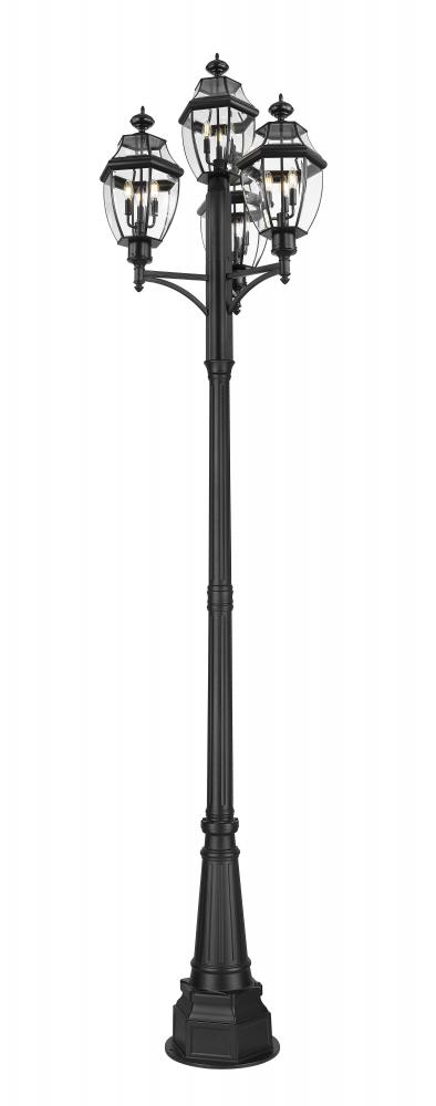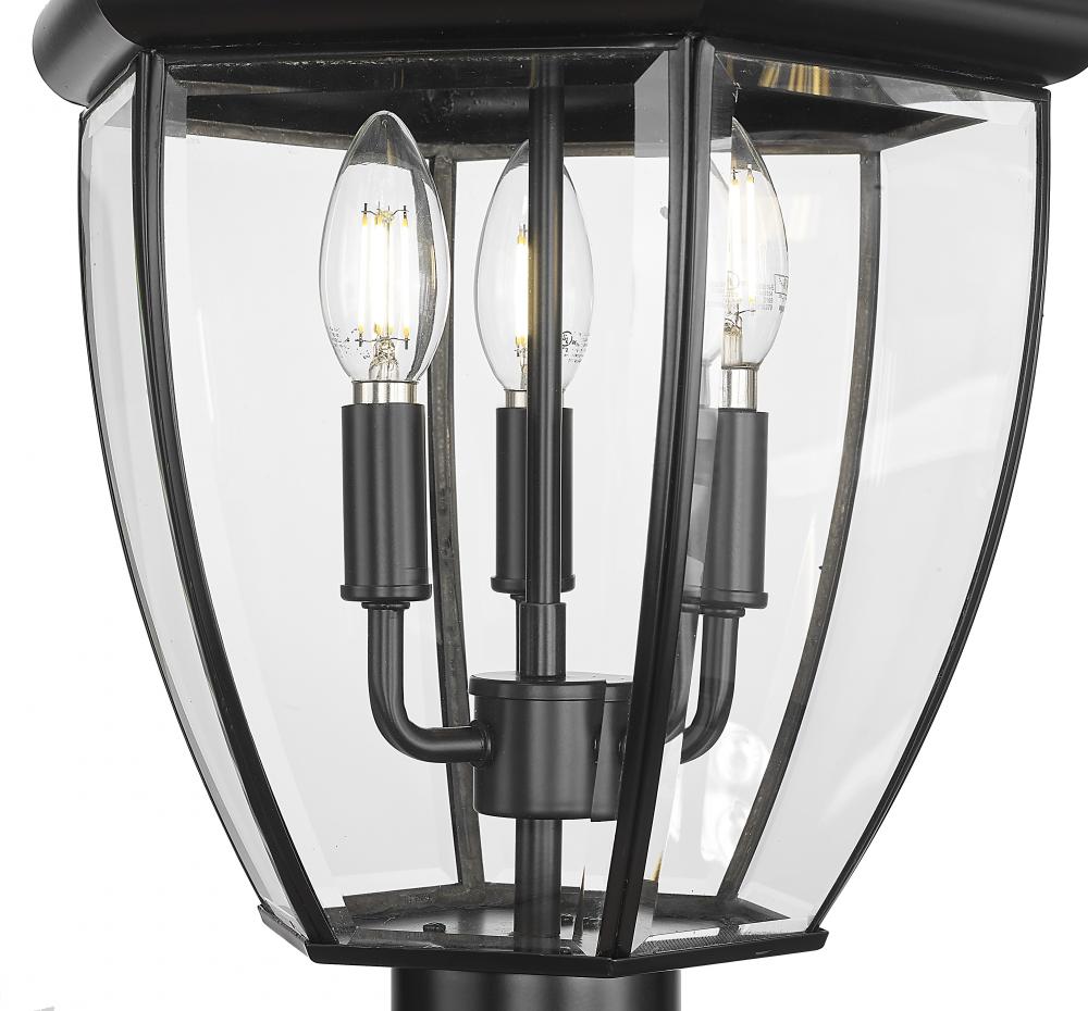 This three-light outdoor post mount fixture adds a traditional silhouette to the lighting in your patio, deck or other outdoor area. With its candelabra composition, the lamp provides soft, effective illumination. A multi-sided clear beveled glass shade has a black steel frame, creating an elegant impression.