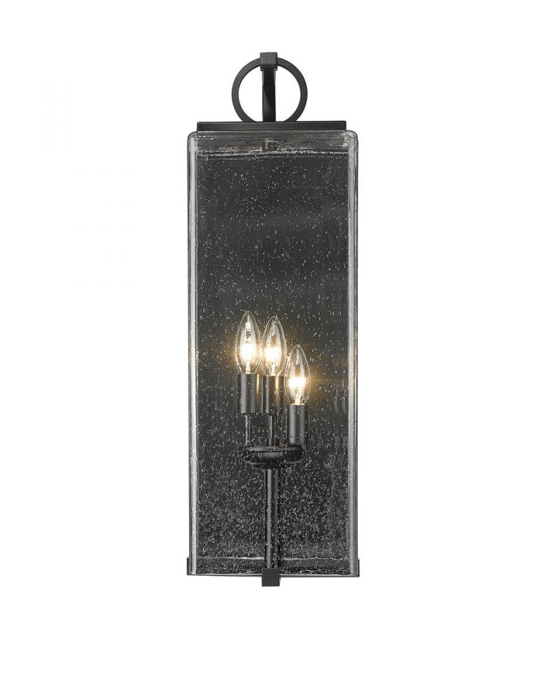 A lovely lantern-inspired silhouette leads to a three-light outdoor wall light thats suitable for contemporary or coastal exterior decor. Finished in black, this piece features candelabra style bulbs and a seedy glass shade for visual appeal.
