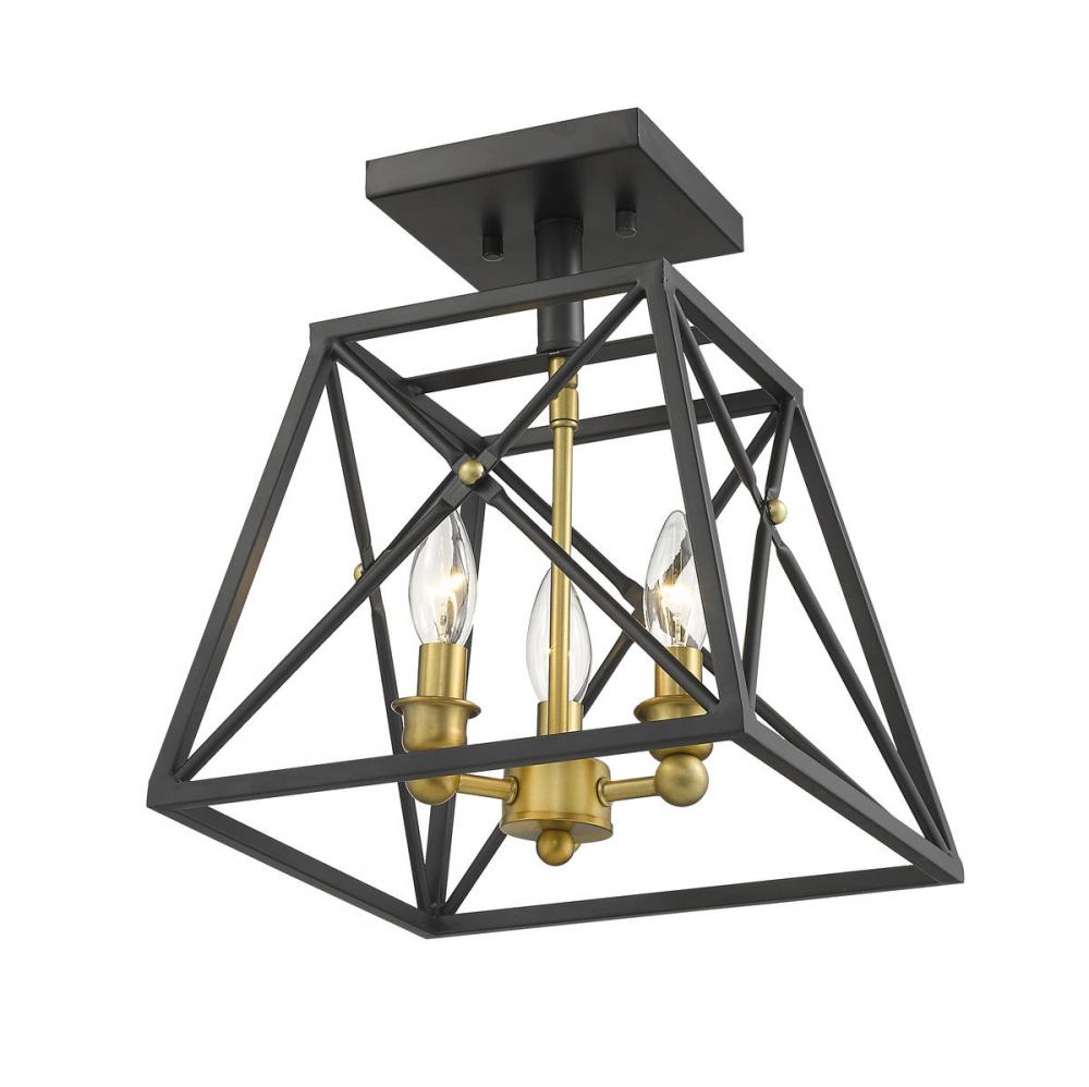 Indulge in an exercise of geometrics and stunning interior d?cor, adding this three-light semi-flush mount ceiling light to a transitional living space. Enjoy the energetic ambiance of a trestle-inspired open metal cage frame with a sleek Matte Black finish, and a charming candelabra bulb mount with a rich Old Brass finish.