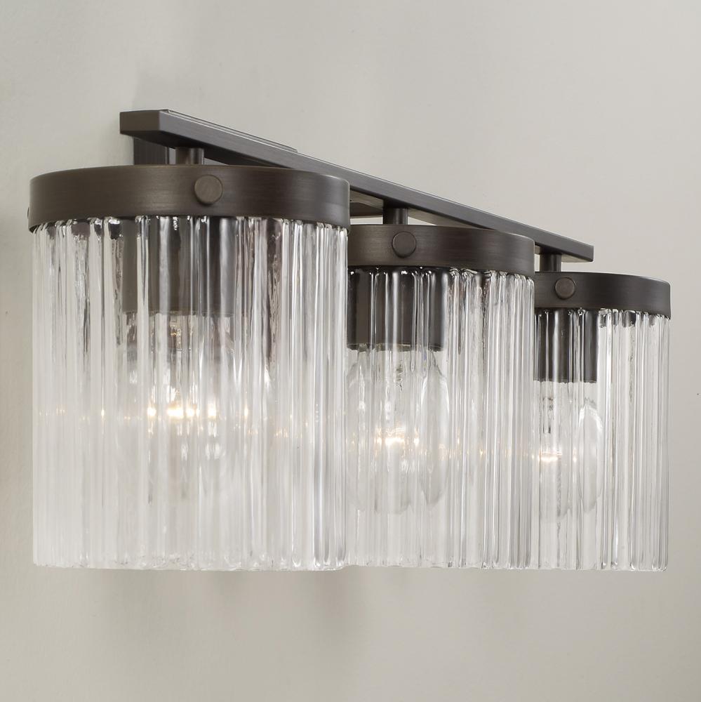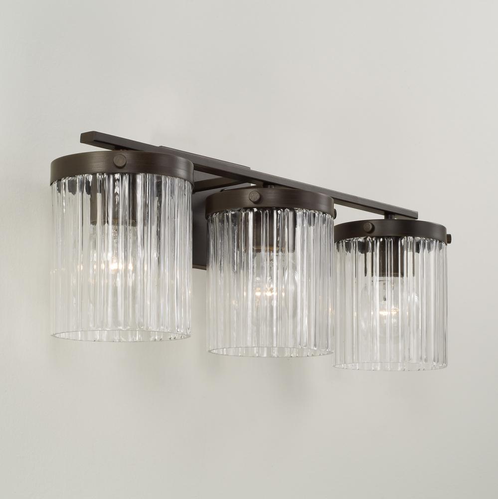 Invite stunning illumination to any powder room with the Vaughn 3-Light Vanity. The Beveled Fluted glass creates captivating texture against the cylindrical silhouettes, while the Oil Rubbed Bronze finish offers a refined, timeless aesthetic.